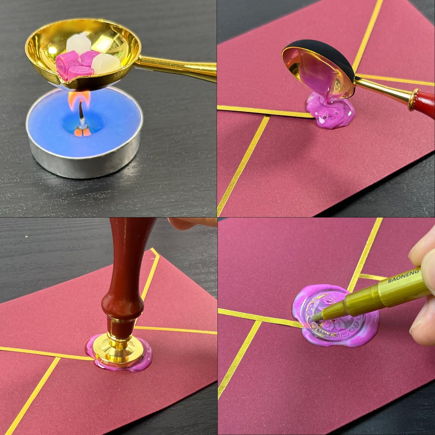 - 【Upgraded Wax Seal Stamp Kit】The package includes 24 colored wax sealing beads, 1 wax melting spoon, 1 wooden wax seal stamp handle, 1 stamps, 10 tea candles, 10 vintage envelopes, 2 metallic pens.
