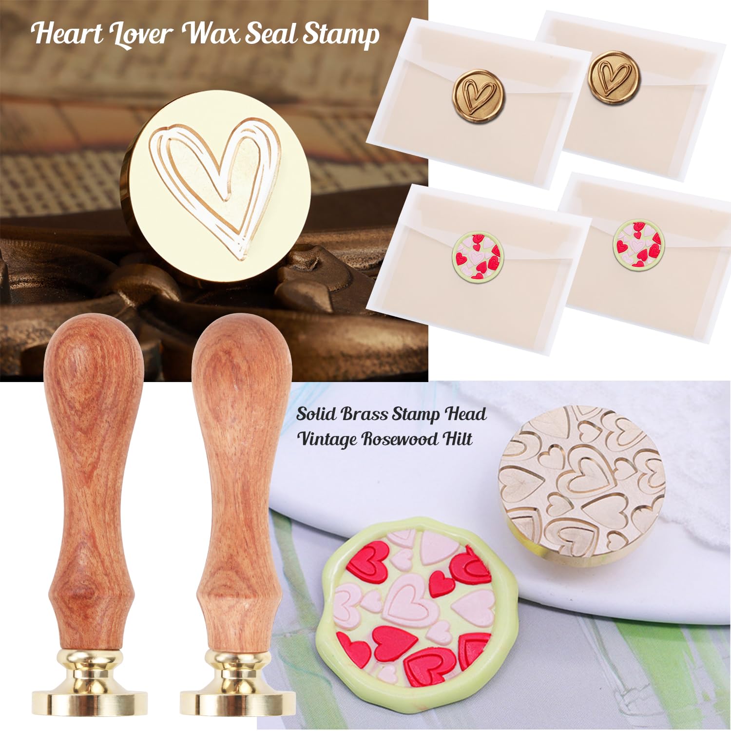 - TWO WAX SEAL STAMPS: WASOHLING sealing wax kit comes with 2 pieces of love heart wax sealing stamps in 2 different patterns. The wax stamps are made of brass head and wooden Handle. The detail on the stamp face is very clear that will create a nice and clean seal stamp with lovely image.