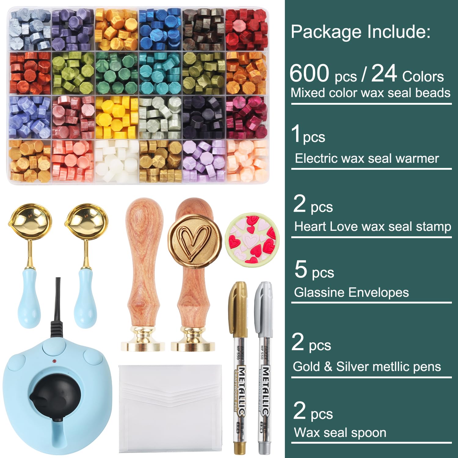 - COMPLETE WAX SEAL KIT: The wax seal stamp kit includes everything you need to create beautiful and personalized wax seals. With 24 metallic assorted colors wax seal beads 600pcs, 2 pieces of love heart wax sealing stamps in 2 different patterns, 1pcs electric wax seal warmer with 2pcs spoon, 5pcs Semi transparent frosted Envelopes and 2pcs metallic marker pen in gold and silver. which is a perfect gift for your lover, friends and family on birthdays, Valentine's Day, Mother's Day, Christmas, Anniversary, and so on.