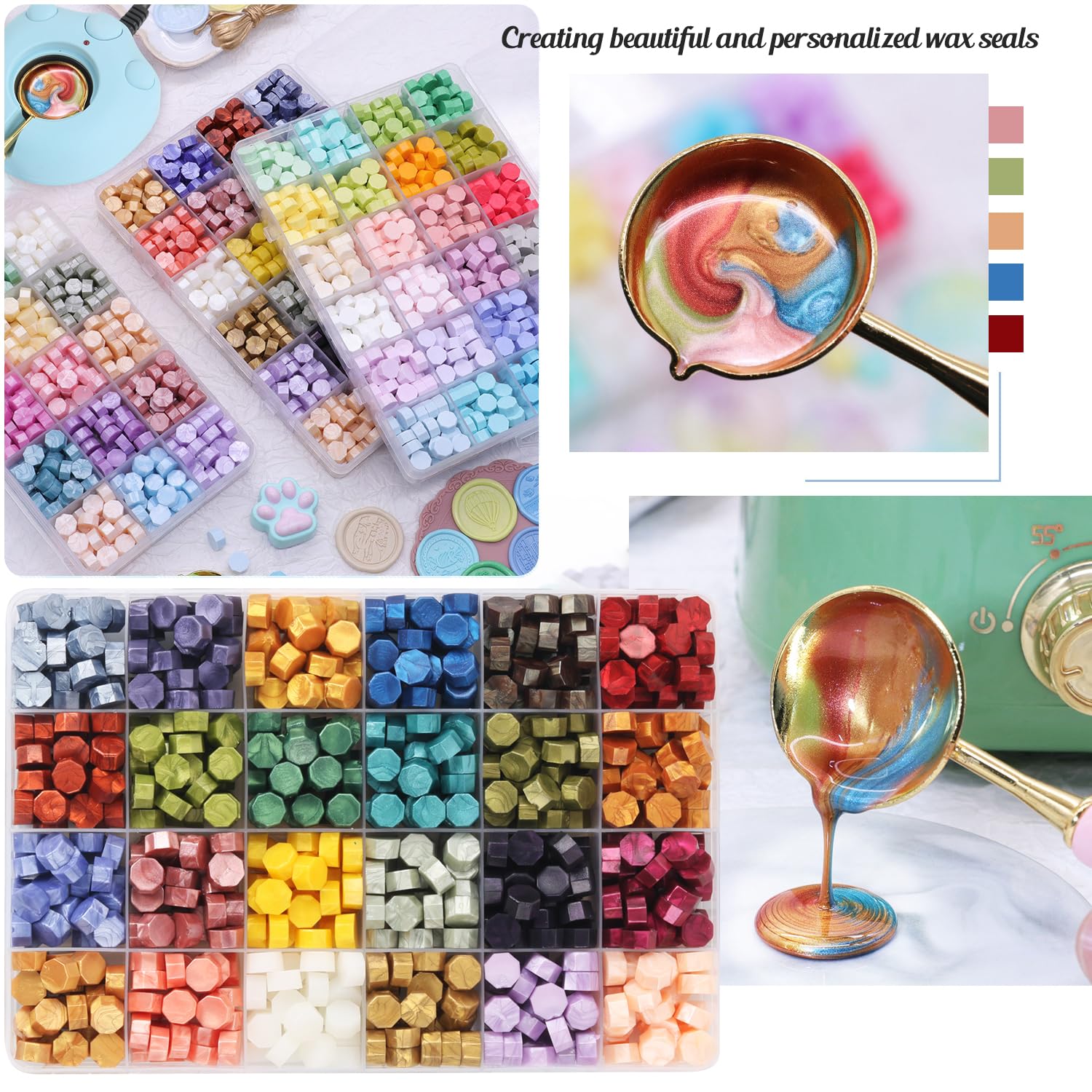 - MULTI-COLORS SEALING WAX: These wax sealing beads are made of good quality resin and wax, smokeless, odorless, non-toxic, melt easily and dry quick that are super easy to print. There are totally 600 pieces of letter wax beads in 24 different colors,Providing you a good selection of colors to meet your needs when doing your wax stamp seals.