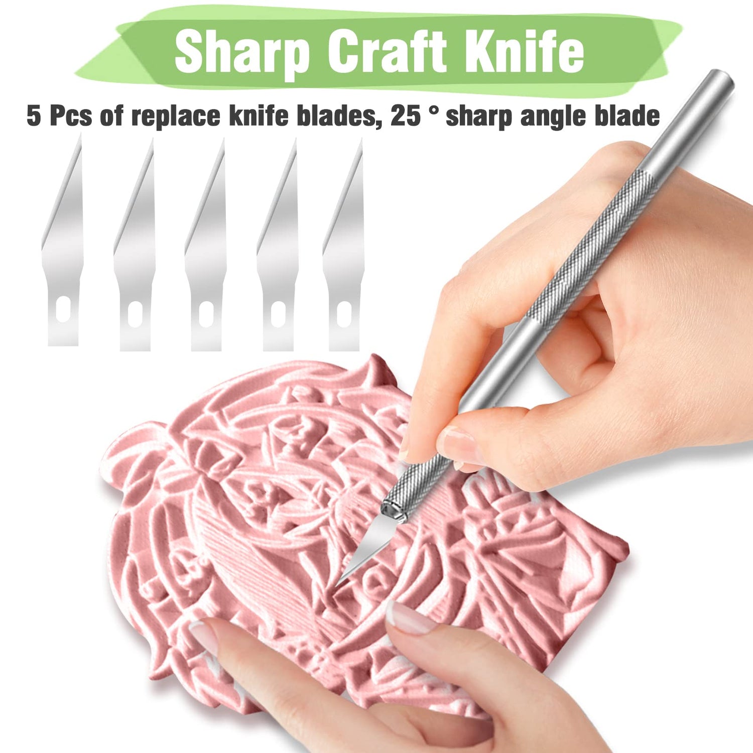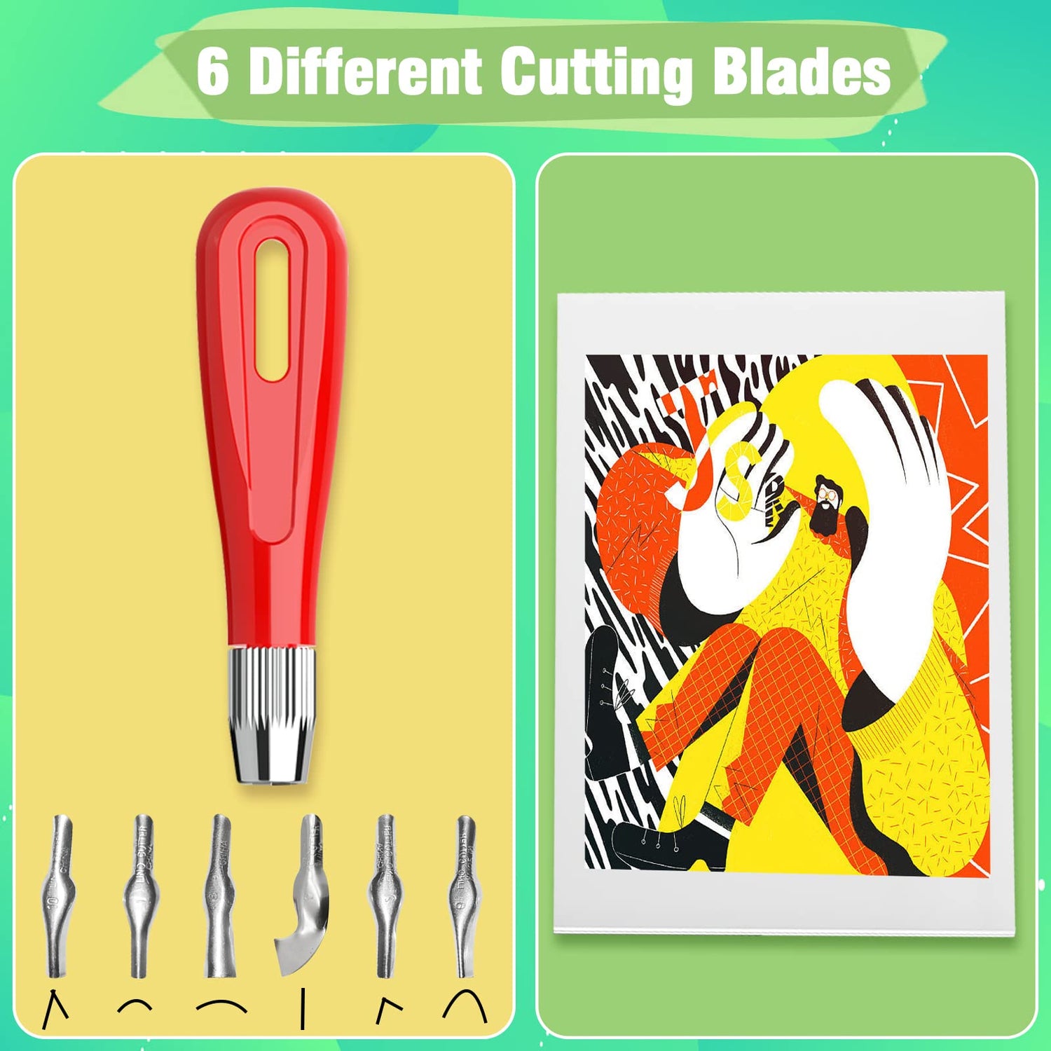 - What's Included: The package comes with 10 pcs rubber carving blocks, 1 linoleum cutter kit with 6 pcs types blades, 1 black ink pad,1 red ink pad, and 1 pc hobby knife including 5 pcs carving blades.