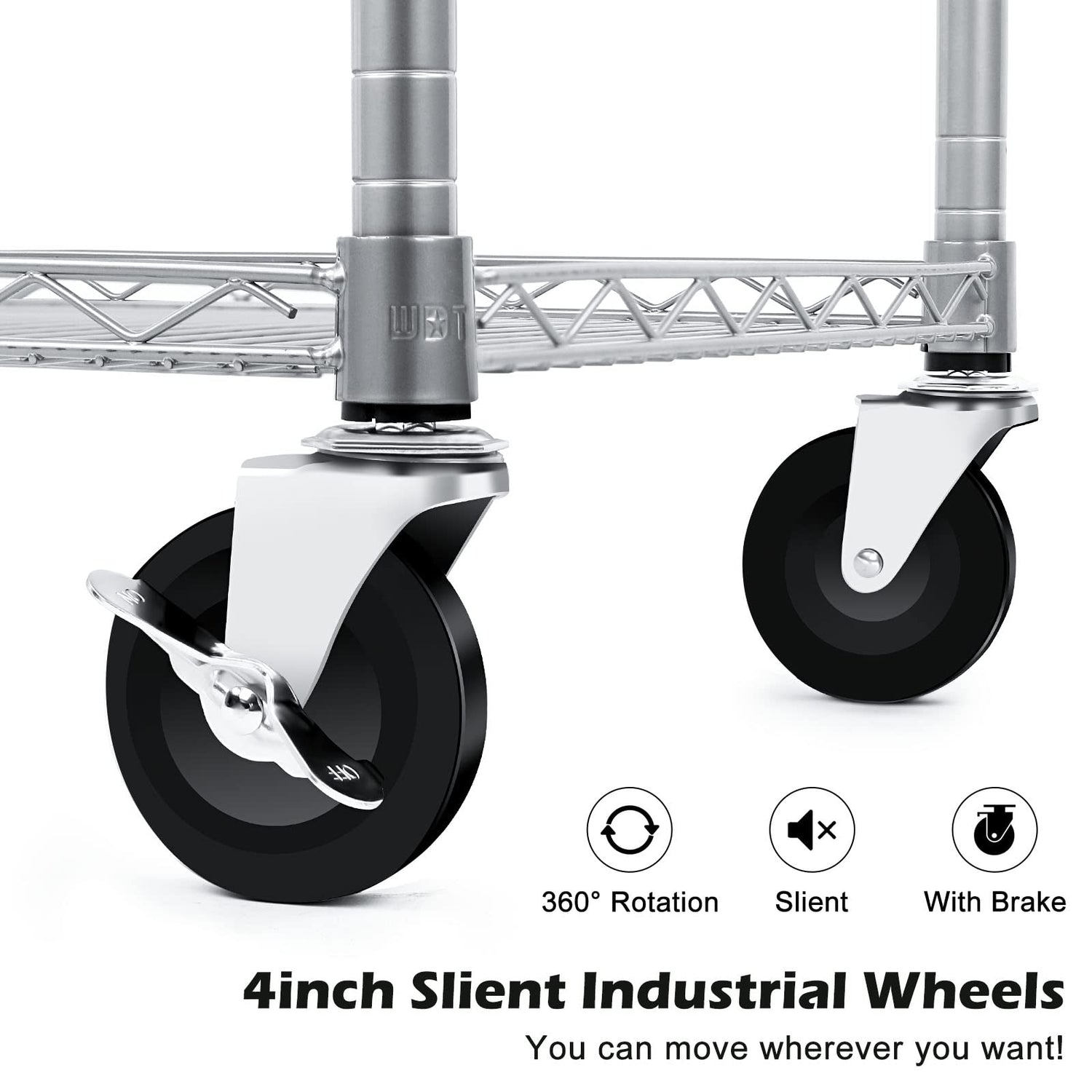- 990Lbs Capacity & Anti-Rust : WDT This Commercial Grade Rolling Utility Cart is constructed from high quality industrial strength metal, and equipped with 1 inch diameter poles. Can hold up to 990lbs on wheels. This kitchen utility cart metal surface with anti-rust chrome plated, it will not rust make it easy to clean.