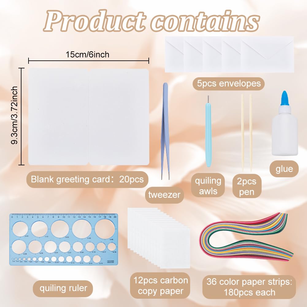 - Quilling Kit Contains:20 blank cards,180 pieces 36 color strips,2 bamboo stick pen,5 carbon paper,5 envelopes,1 quilting paper pen,1 diffraction ruler,1 tweezer and 1 glue.Includes all the basic quilting tools needed for DIY