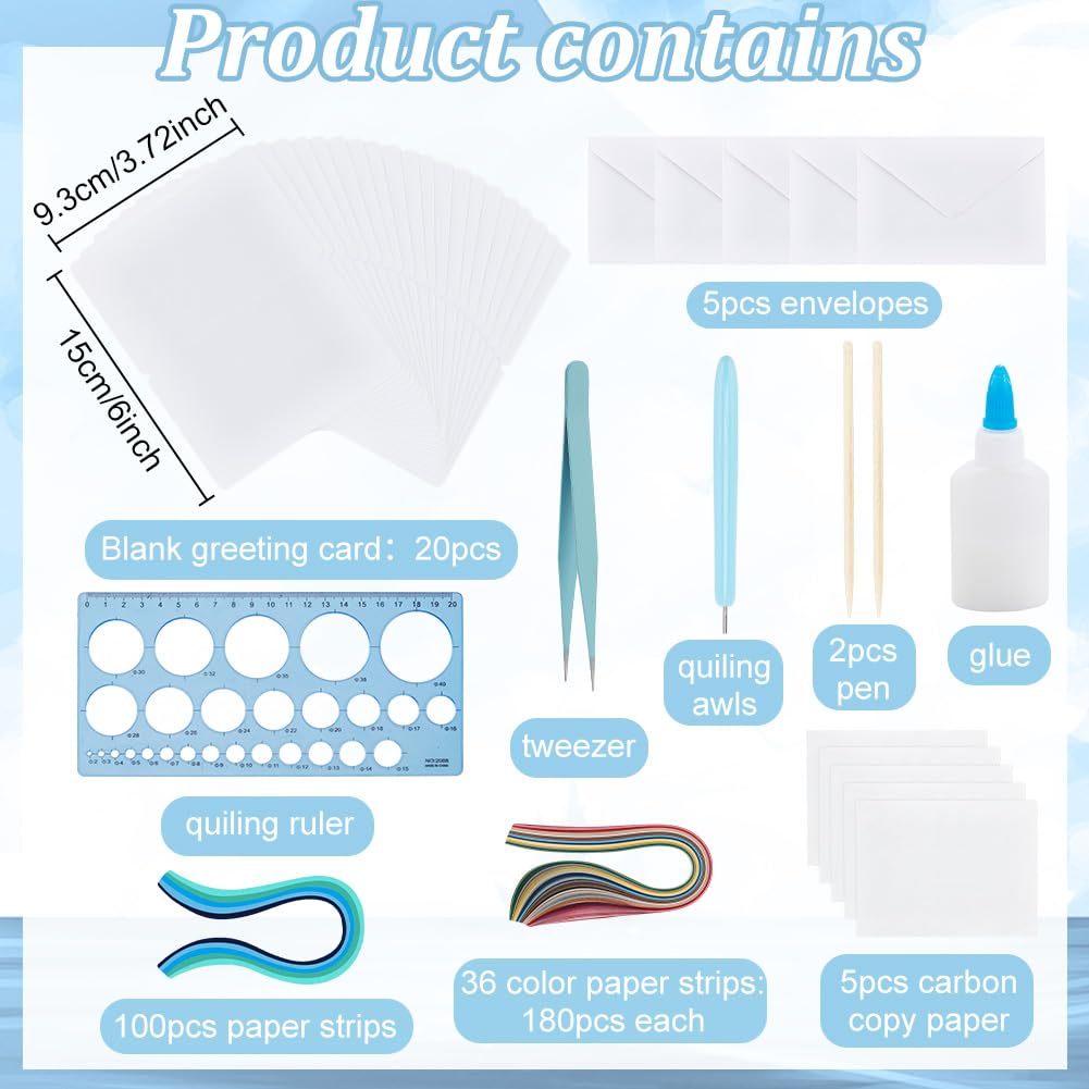 - Value Pack:The package you receive contains 20 blank cards,180 pieces 36 color strips,100 pieces blue color strips,2 bamboo stick pen,5 carbon paper,5 envelopes,1 quilting paper pen,1 diffraction ruler,1 tweezer and 1 glue