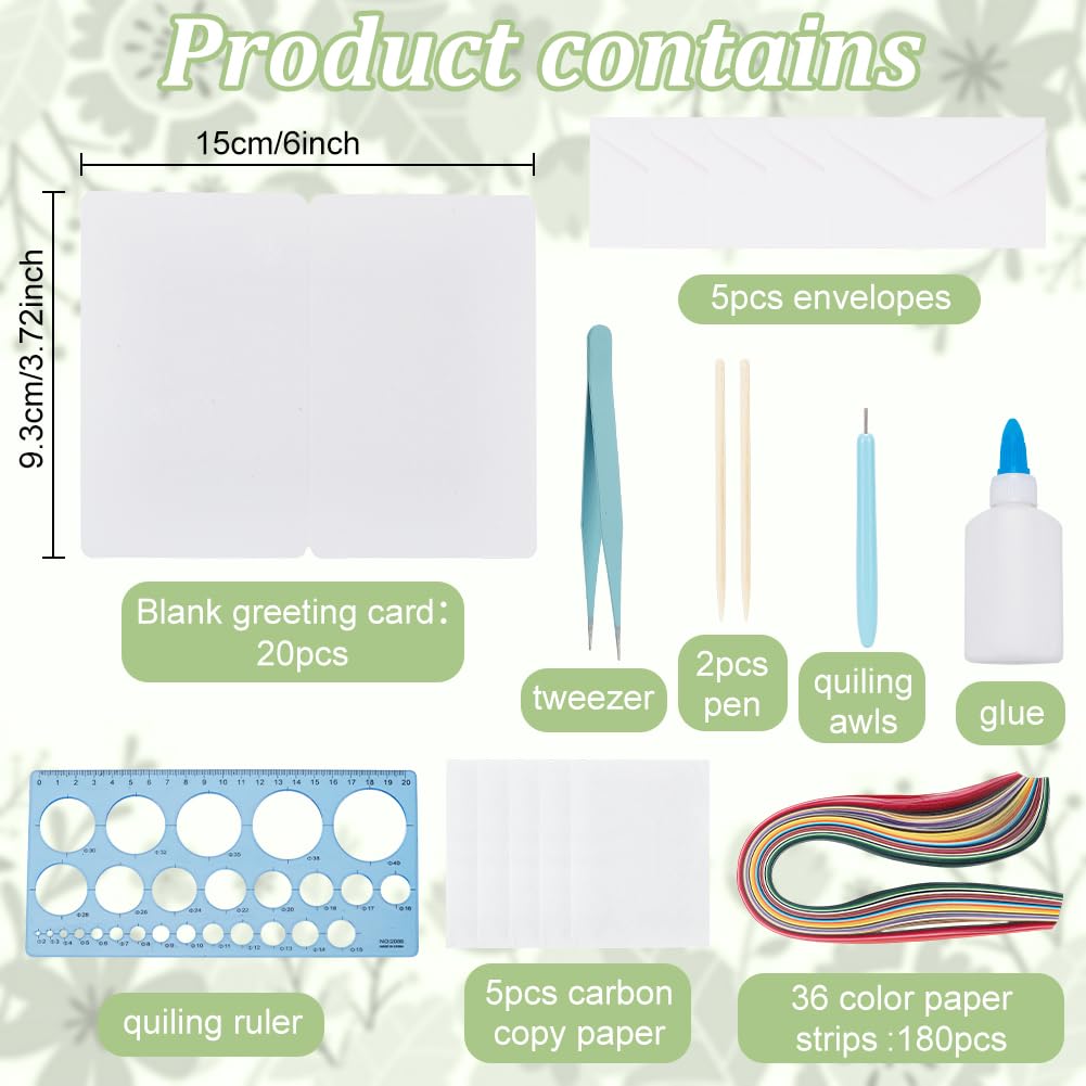 - Quilling Kit Contains:The package you receive contains 20 blank cards,180 pieces 36 colour strips,5 envelopes, 5 copy paper, 2 quilting paper pen,1 quilting ruler,1 tweezer and 1 glue,which are enough to meet the diverse needs of your daily life