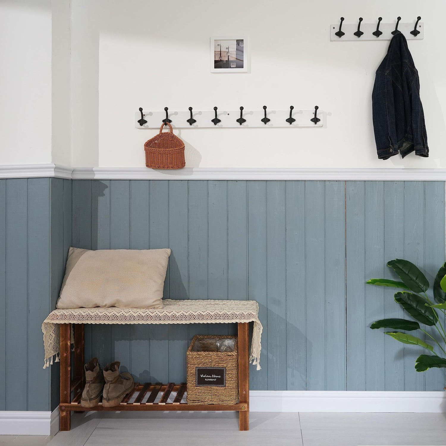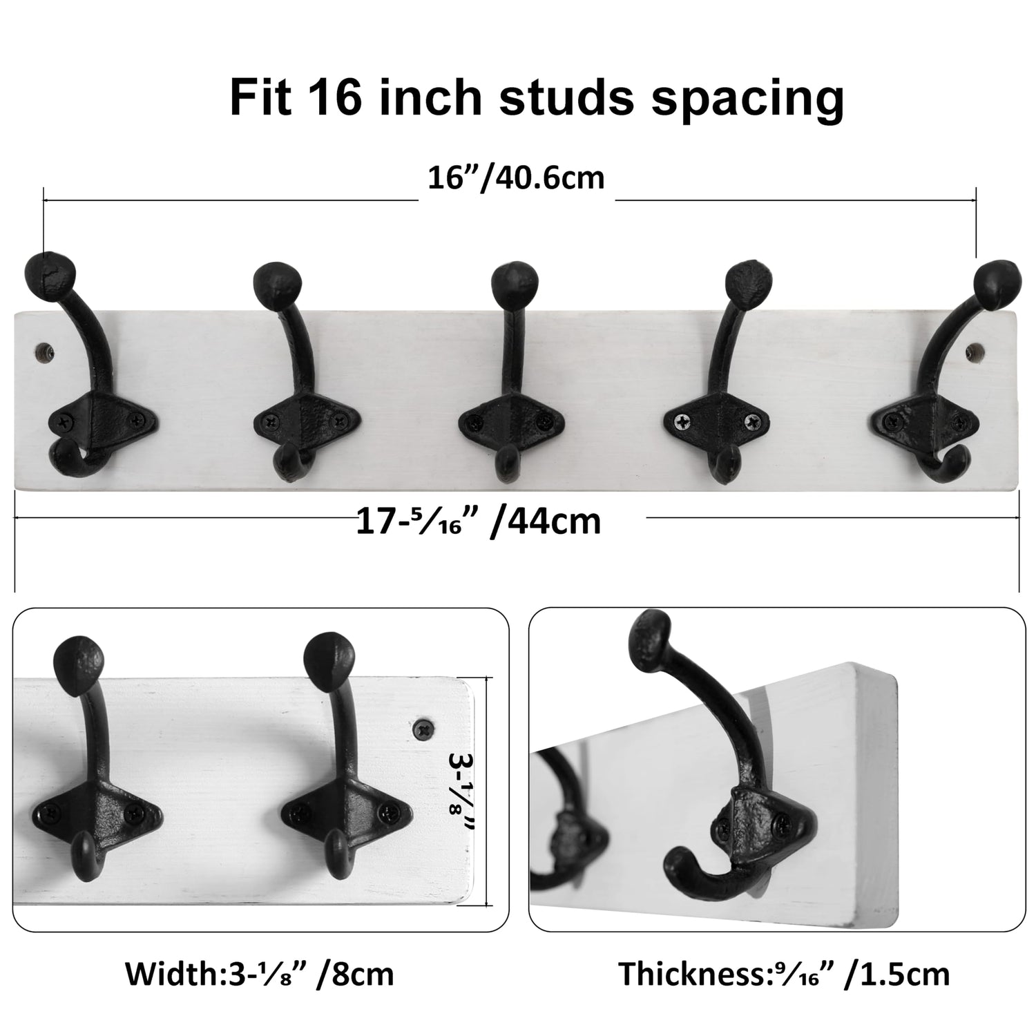 - 【Fit Standard Stud Spacing】:Hole to hole spacing:16 inch,mounting hole spacing match stud spacing.Size:17.32" * 2.95“ * 3.54".Wood base size:17.32" * 3.15".Vintage style cast iron coat hooks wall mounted.