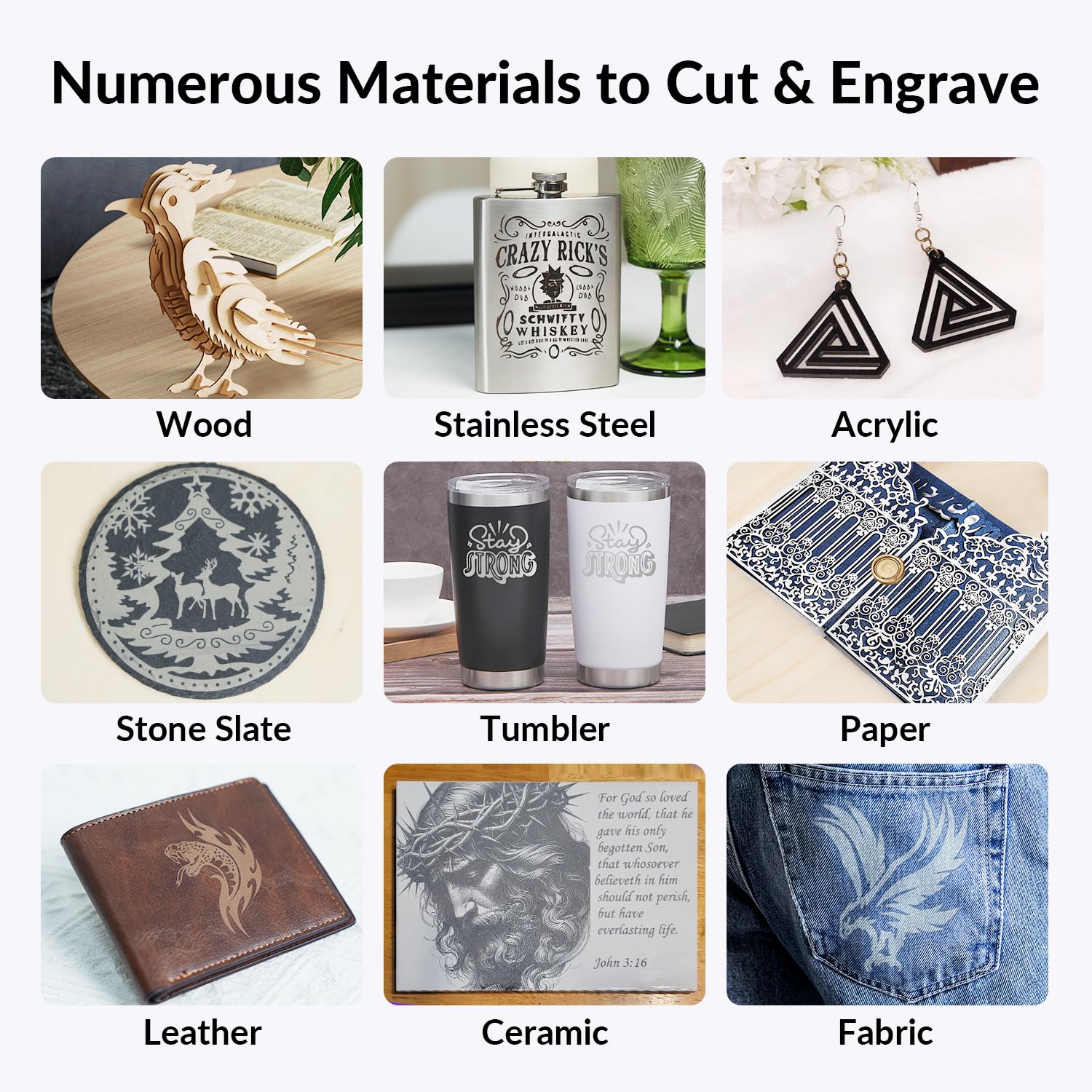 - With FDA Class 1 safety certification, this engraver is safe for both you and your surroundings. The lid sensor ensures the machine stops immediately when opened and resumes work once closed. Cut through 10mm wood or 8mm black acrylic with ease. Whether you're engraving on wood, cardboard, acrylic, cookies, chocolates, or felt, this machine has the power and versatility to handle it all.