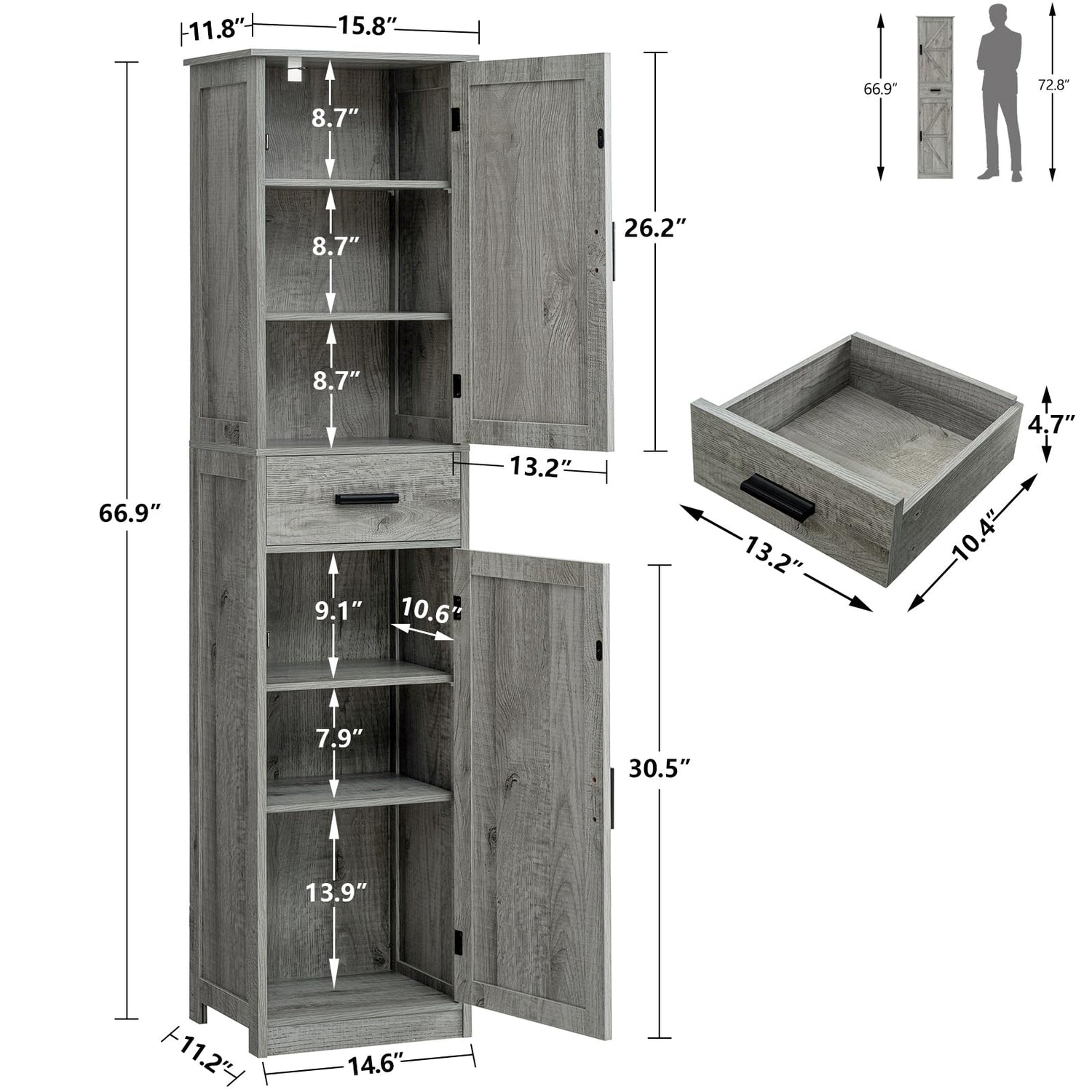 Standing at an impressive height of 66.9", this cabinet boasts an abundance of storage with six hidden shelves and a convenient drawer, allowing you to neatly organise all your essentials, from toiletries and cleaning supplies to kitchen staples and decorative items. The cabinet's modern grey wood grain finish not only enhances its aesthetic appeal but also ensures durability and stability, thanks to its P2 grade MDF construction.