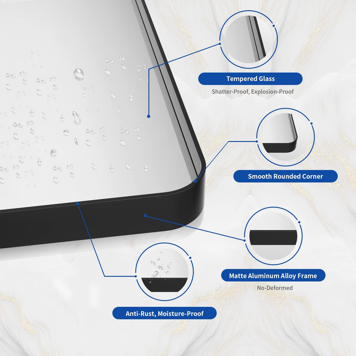 - 【Shatterproof Tempered Glass】: All WEER matte black mirror for bathroom is built with 4MM tempered glass which is shatter-proof, burst-proof and more safer to use. The shatterproof film is the important layer that will not splash into pieces when it's broken.