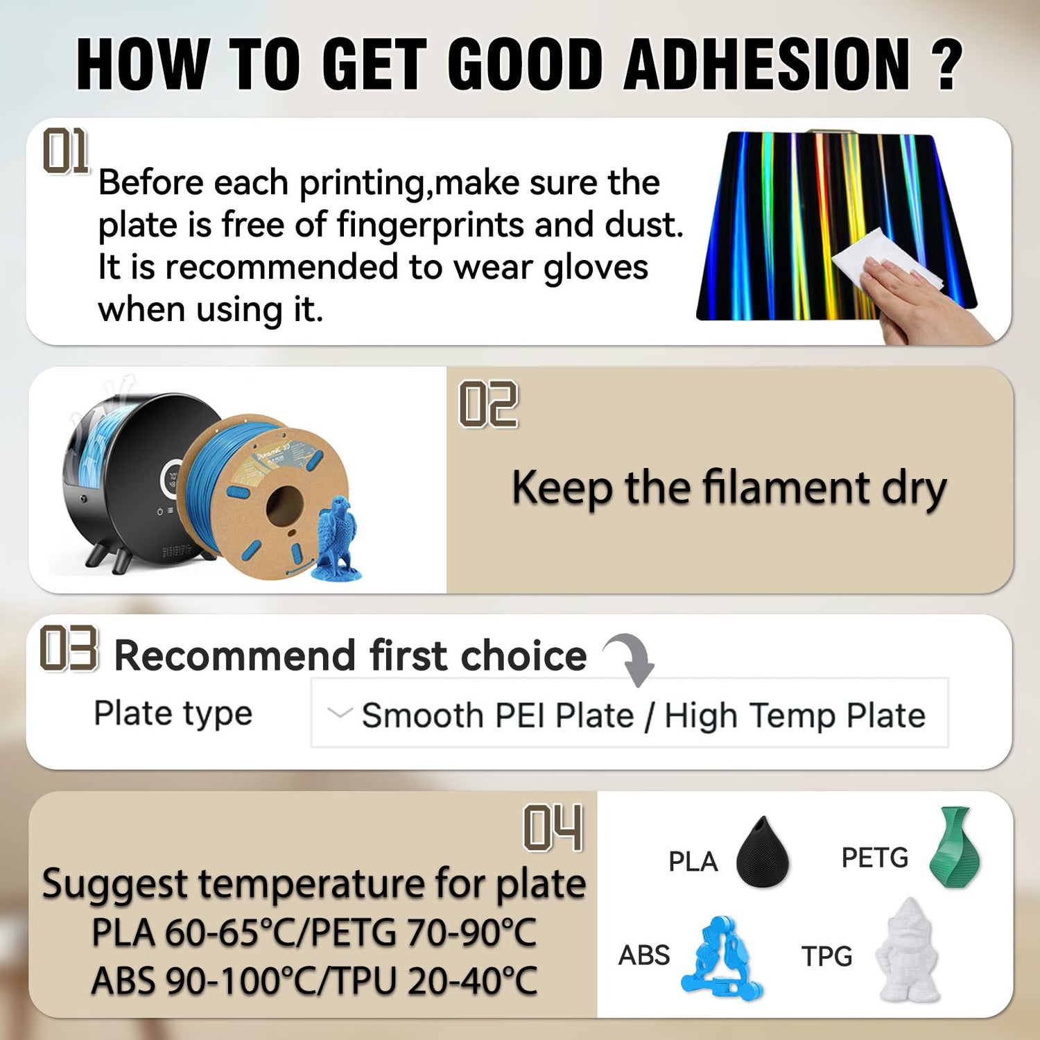 - 【Excellent adhesion for first printing layer】The model can be firmly attached to the surface of the print bed.Easily print even for a newbie. The H1H spring steel flexible build plate (257x257mm) has a good adhesion,even better than smooth PEI PET or PEO. It even can stick well without heating the platform, no glue needed.Please let the build plate cool down before remove the model to avoid damaging the coating.