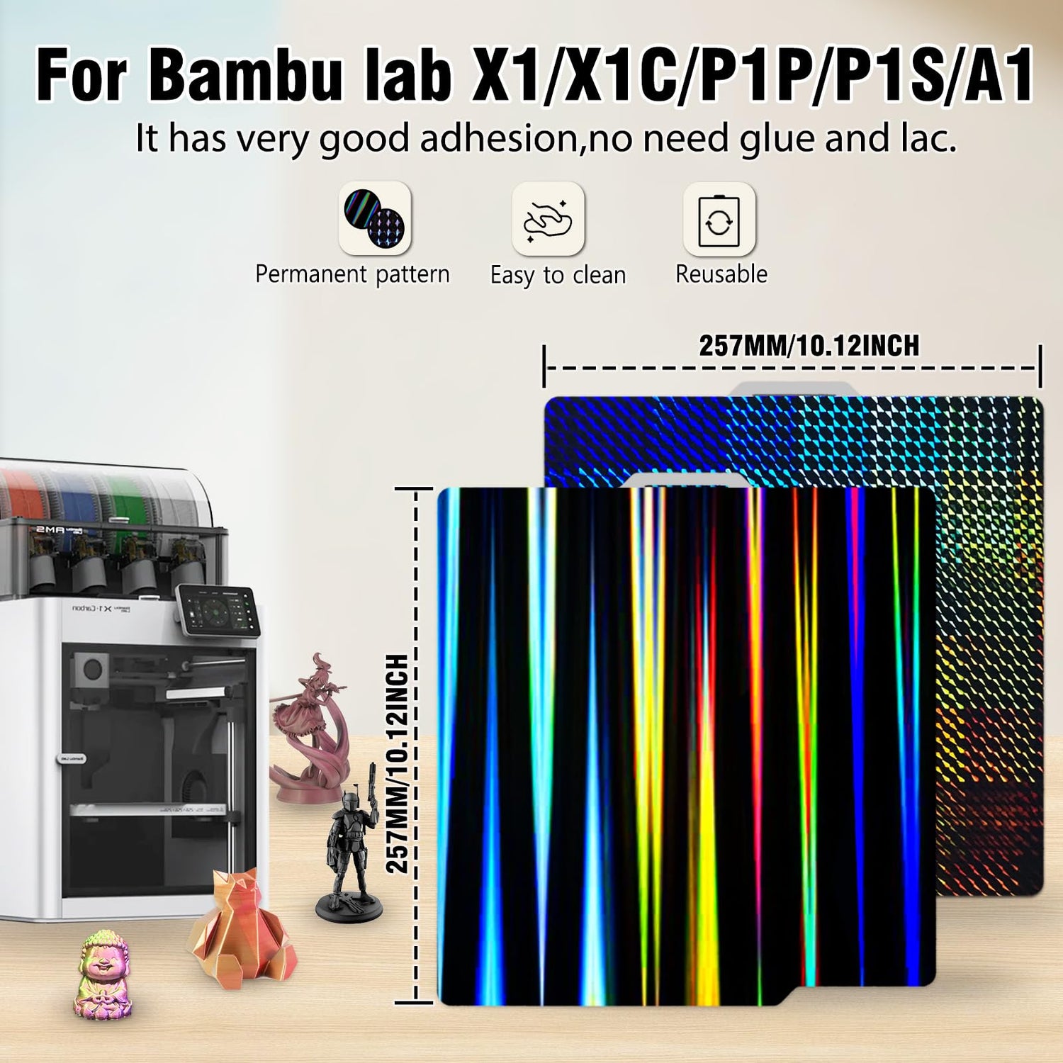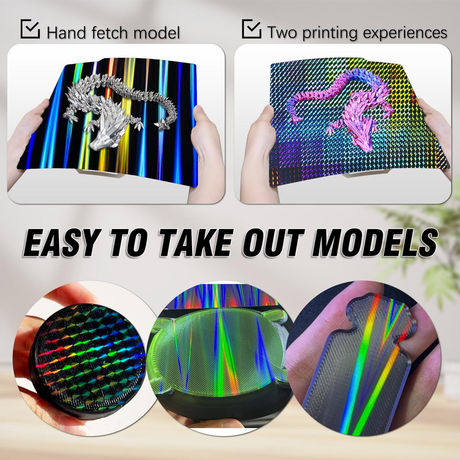 - 【New upgraded H1H build plate】One side is a Light beam pattern, which dances in the space like neon-like light strips, vividly displaying natural colors and light with its soft arcs.The other side is a phantom pattern, which seems to be a subtle fusion of reality and dream, creating a fascinating illusion and stunning look.The combination of phantom and beam brings new fun to your 3D printing.