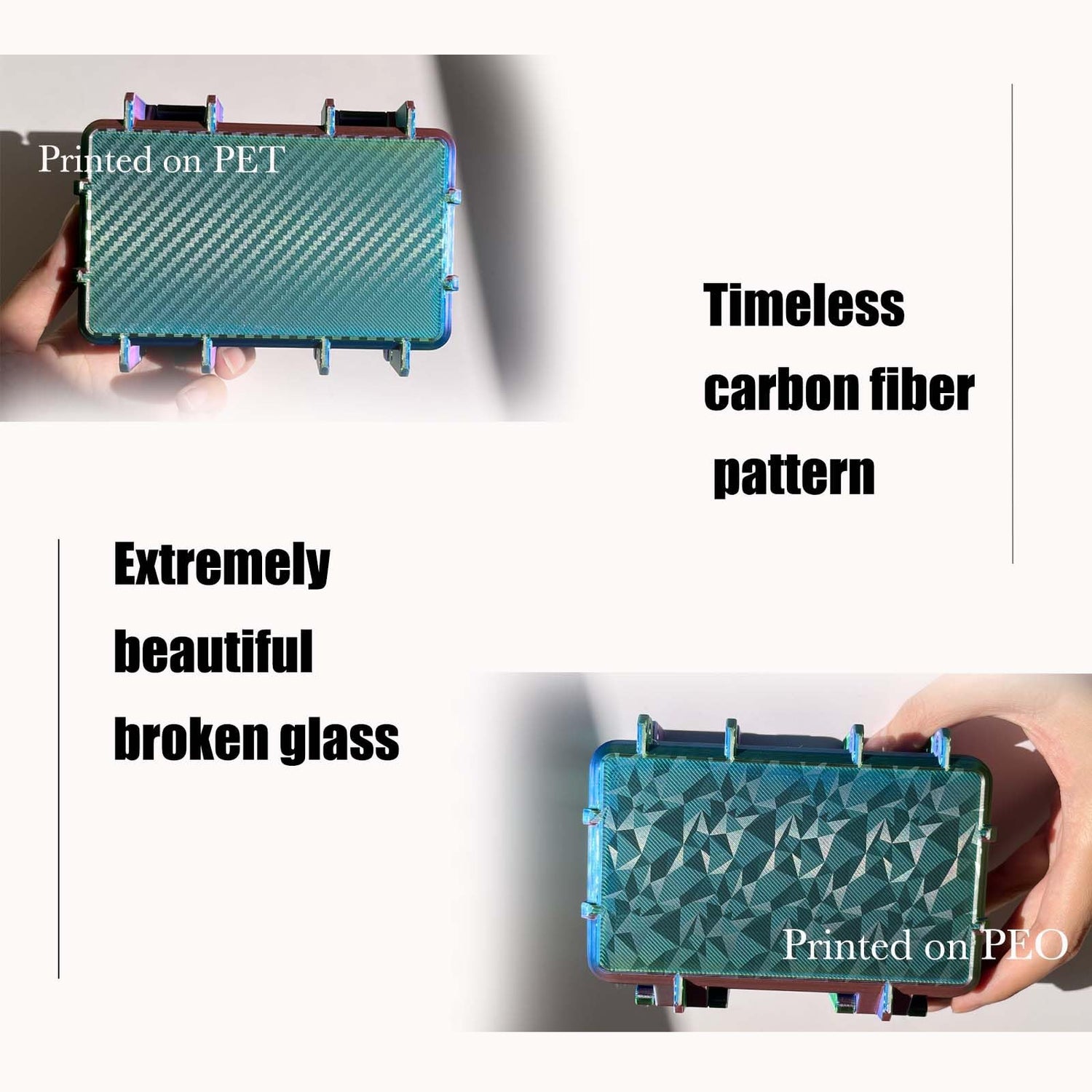 - 【Upgraded build plate】Double-sided PEO+PET spring steel plate,One side is upgraded PEO film .PEO looks like countless diamonds on the surface,which make your eyes light up.The other side is classic carbon fiber PET film.The bottom of the printed model is smooth.One build plate has two beautiful patterns. The bottom of the prints will leave a unique pattern.
