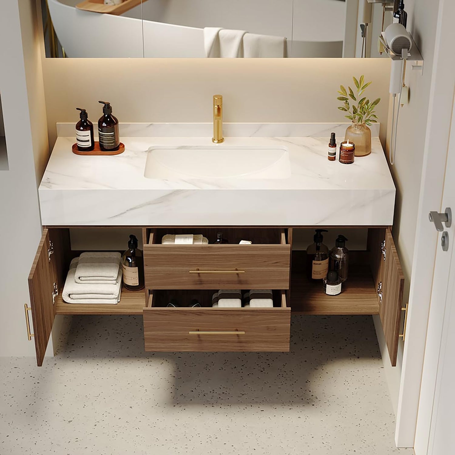 - Easy Installation Floating Vanity: This modern bathroom vanity comes in two separate packages (vanity top + pre-assembled cabinet body). Easy to install with minimal assembly required.