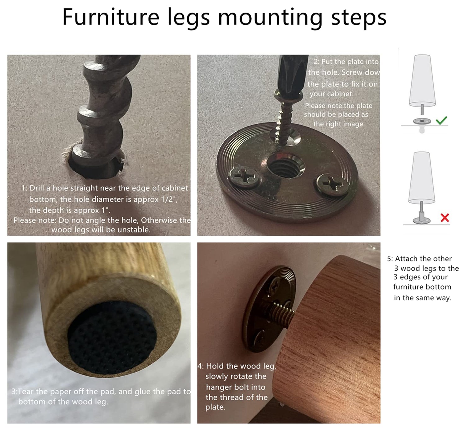 Details: Package include 4-pack 8" height wood legs. Note: In order to make the product better, we add the hardware for free in the package recently. If the package come without hardware, you can search the ASIN B09D3RWVGF on the amazon page, and find the hardware packet. Purchase it, and send email to ask for refund from us as you recieve it, please provide your order number in the email. Mount Steps 1: Drill a hole straight near the edge of your cabinet bottom, the hole diameter is approx 7/16", the depth is approx 1". Please note: Do not angle the hole, Otherwise the wood legs will be unstable. 2: Put the plate into the hole. 3: Screw down the plate to fix it on your cabinet. 4: Hold the wood leg, slowly rotate the hanger bolt into the thread of the plate. 5: Tear the paper off the pad, and glue the pad to the bottom of the wood leg. 6: Attach the other 3 wood legs to the 3 edges of your cabinet bottom in the same way.