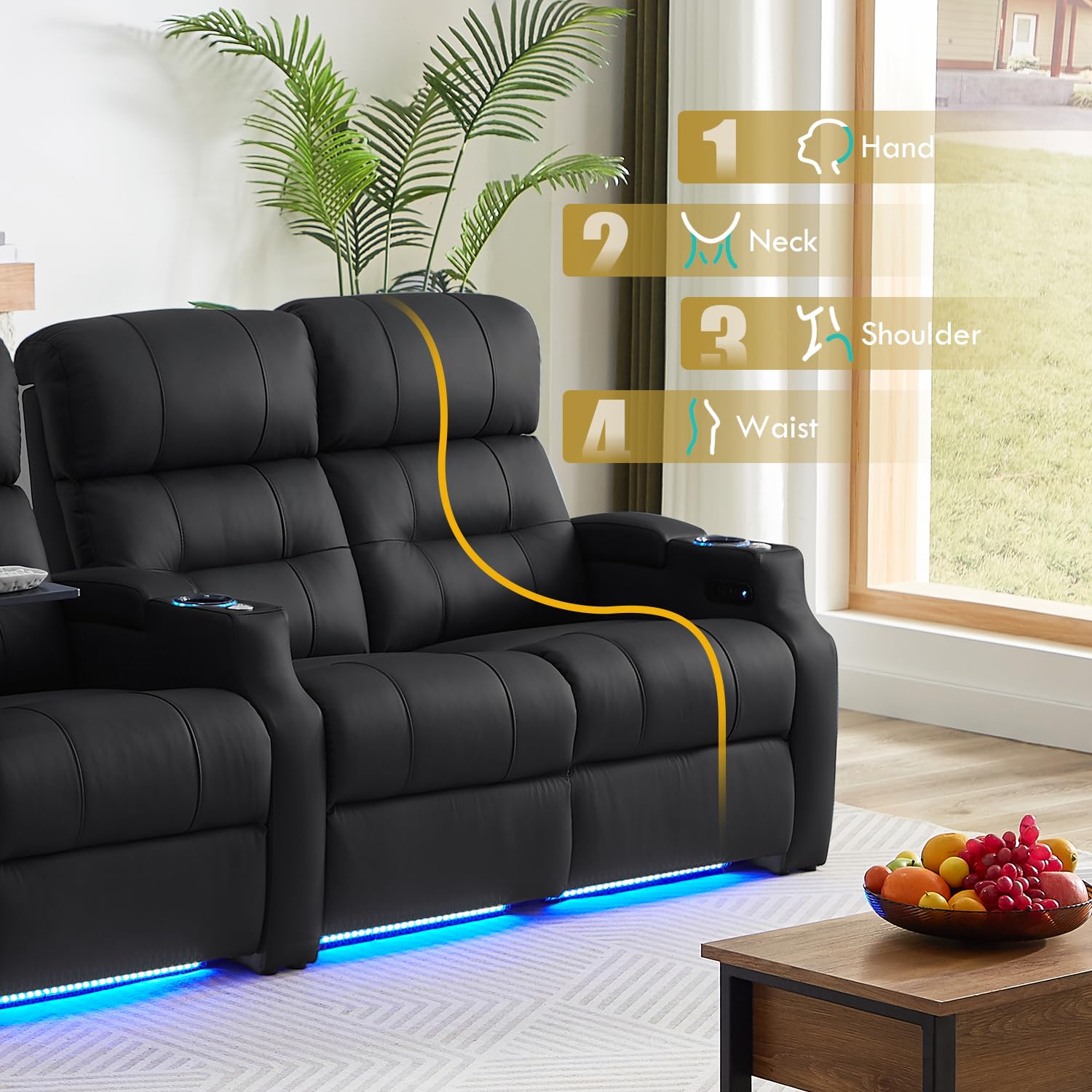 Weilianda Home Theater Seating, Top Grain Leather Sectional Seats Recliner Chair, Zero Gravity Reclining Sofa with Power Headrest 7 Colors Ambient Lighting USB C Charge Row of 3 Black