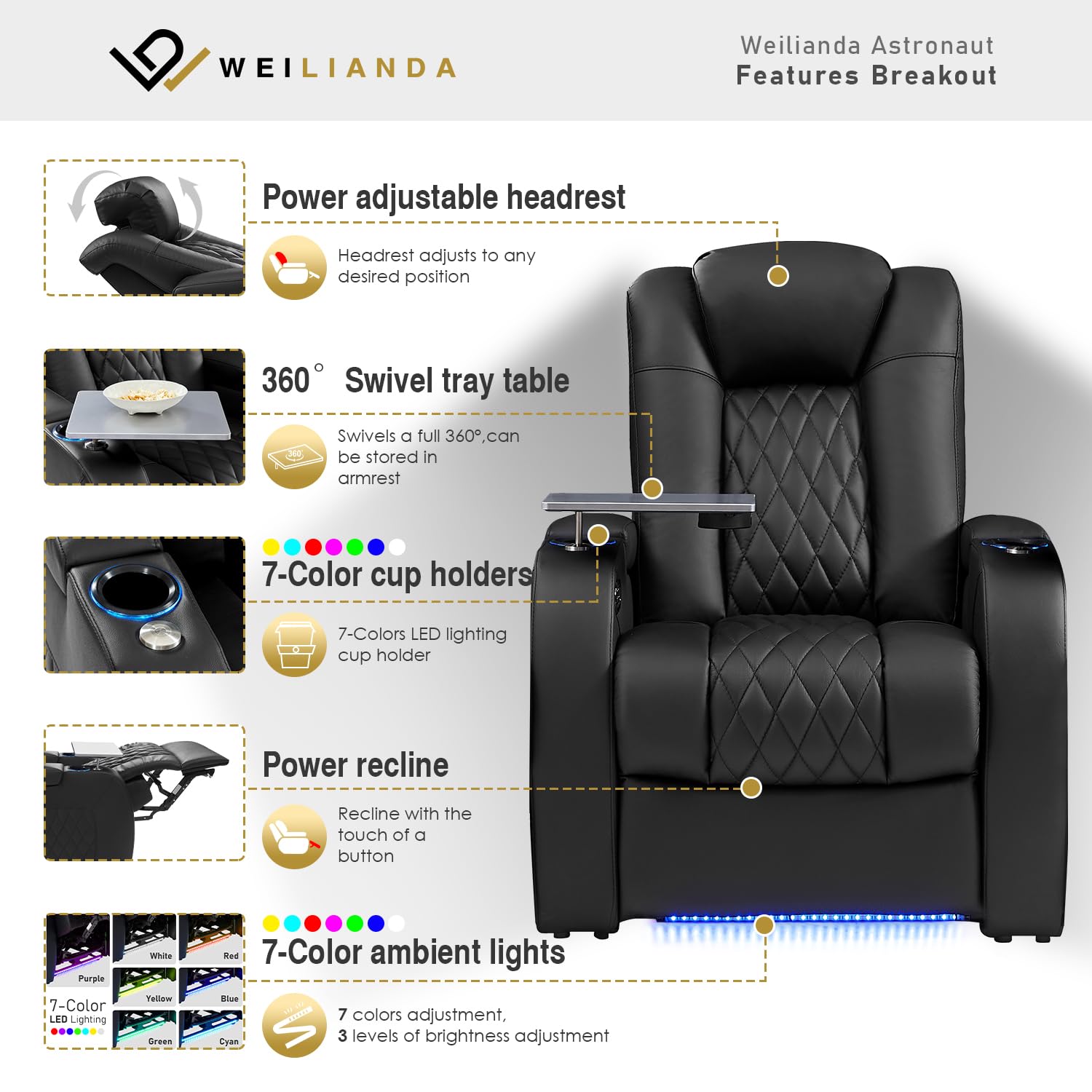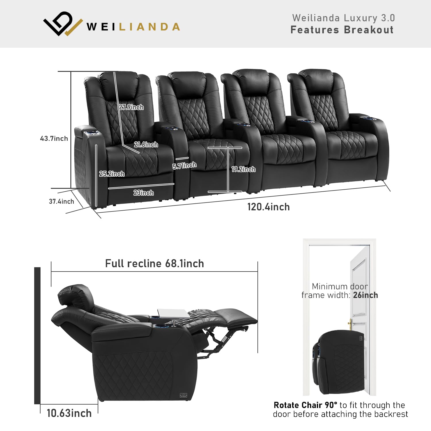 Weilianda Home Theater Seating, Top Grain Leather Zero Gravity Movie Seats Recliner Sofa, Reclining Gaming Couch with Power Lumbar 7 Colors Ambient Lighting USB C Charge Row of 4 Black