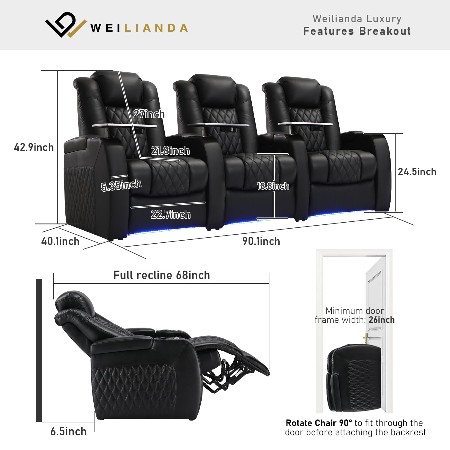 Weilianda Home Theater Seating Top Grain Leather Zero Gravity Recliner Chair Power Headrest Recline Movie Seat Gaming 7 Colors Mood Light Sofa with Tray Table USB Charge Row of 3 Black