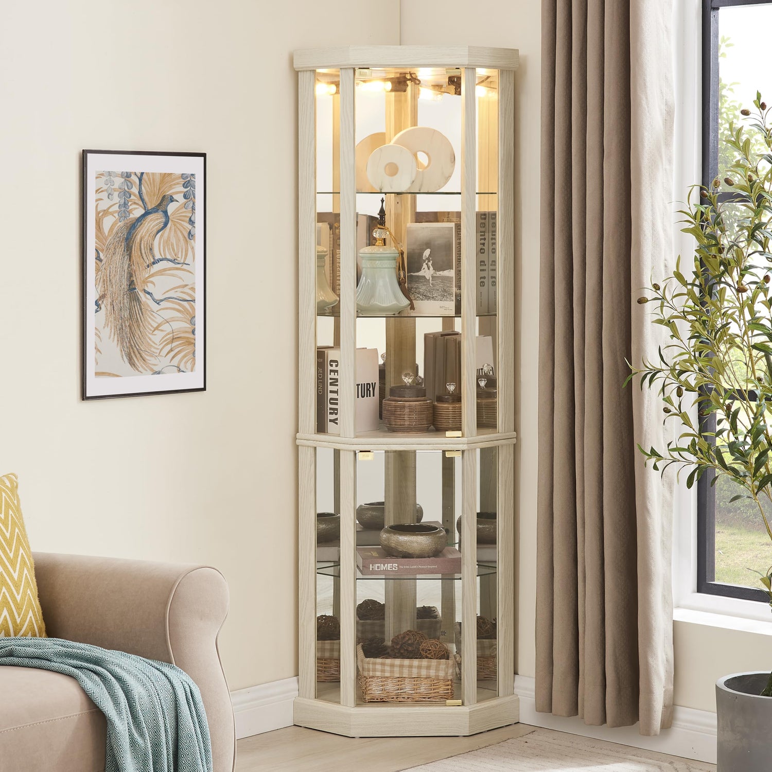 Wekuku Elegant White Lighted Corner Curio Cabinet Glass Display Case for Living Room, Bar Storage, Antique Collections Wine with Built in Lighting