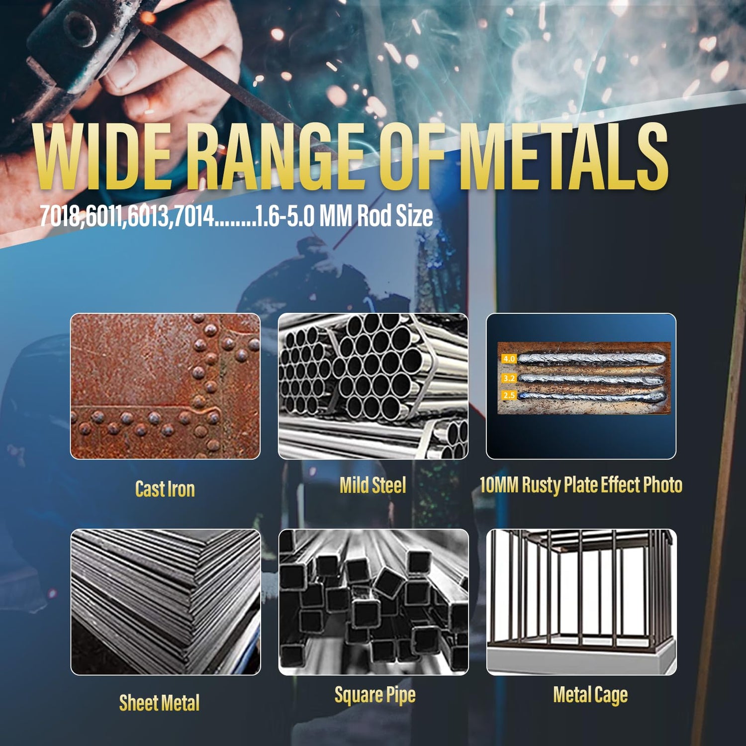 - Easy to Use: Compatible with AWS E6013, E7018, E7014, and E6011 electrodes in 1/16"-1/8" (1.6mm-3.2mm) sizes. This arc welding machine is easy enough for beginners to use and ideal for both DIY projects and professional applications.