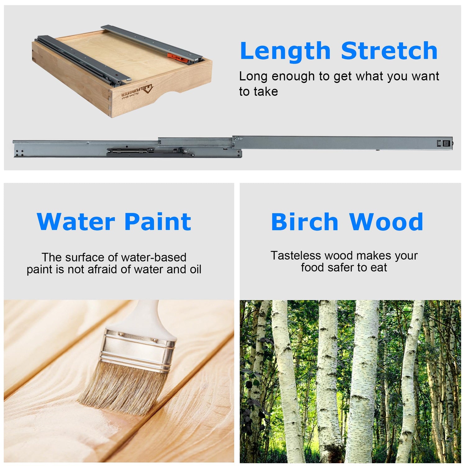 - 【Durable and Sturdy】Our pull out drawers for kitchen cabinets is made of birch, ensuring durability and sturdiness. It can hold up to 50 pounds of weight, making it suitable for heavy pots and pans.