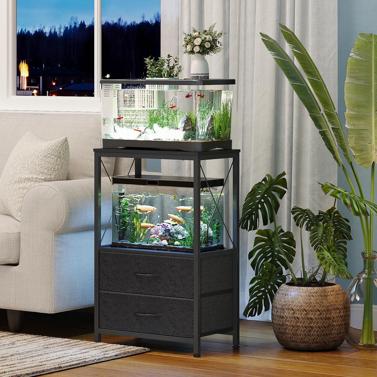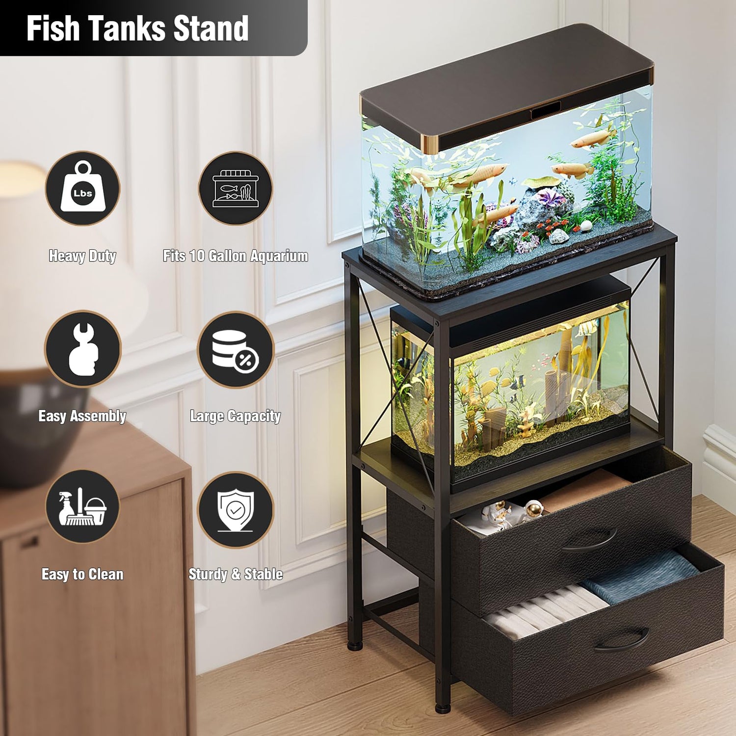 Welfuturer Aquarium Stand 10 Gallon with 2-Tier Shelf, Fish Tanks Stand with 2 Drawers, Metal Frame Heavy Duty Reptile/Turtle Tank Stand for Home Office, Fish Tanks Accessories Storage, Black