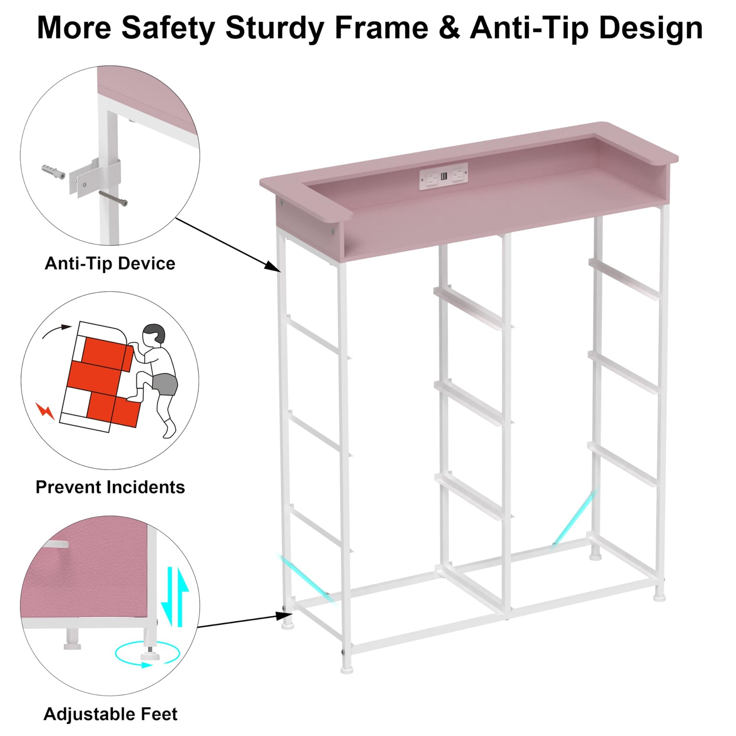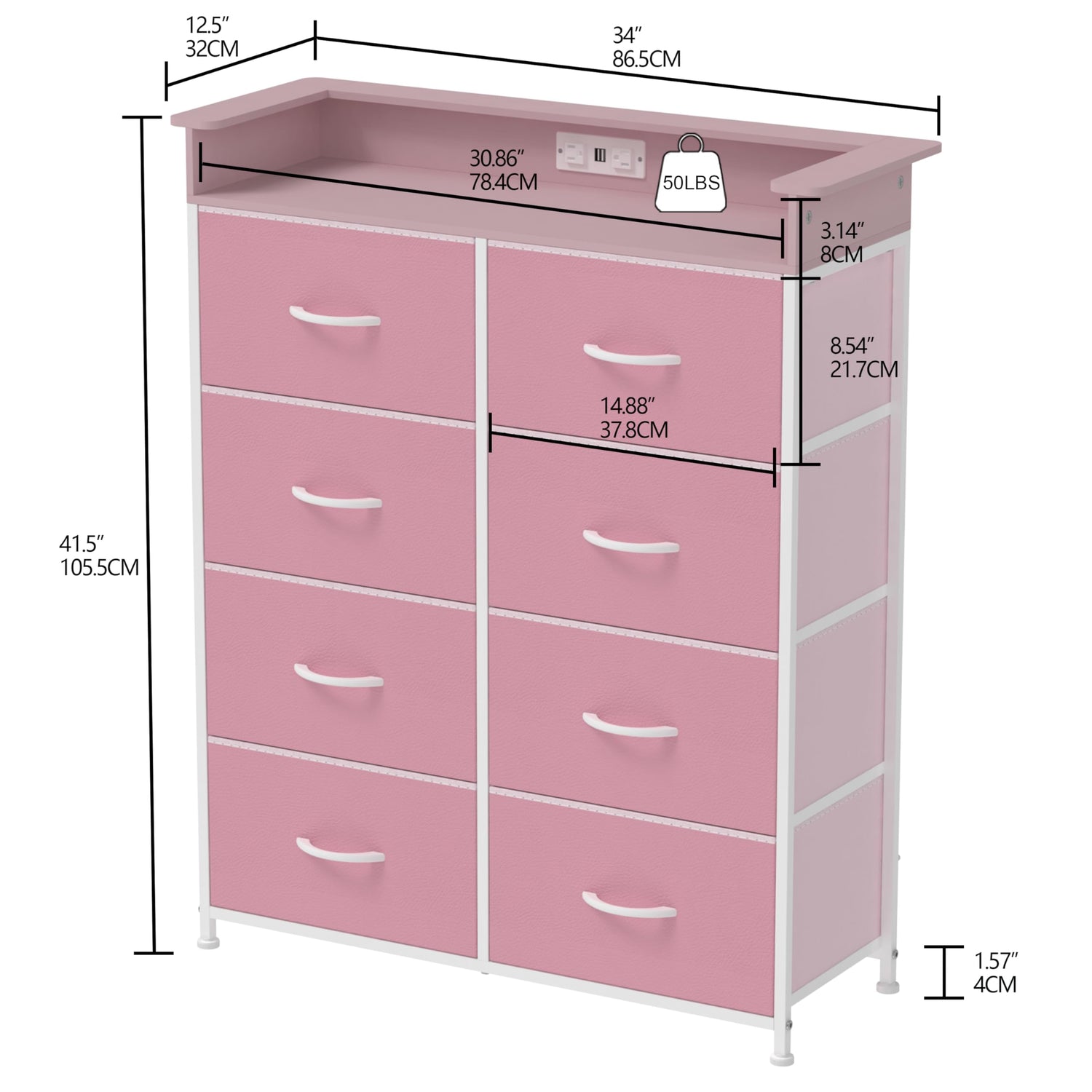 Welfuturer Pink Dresser for Bedroom with Charing Station Dressers with LED Lights Tall Dresser with 8 Drawers Storage Tower for Closet Living Room Hallway Entryway Sturdy Steel Frame Wood Top