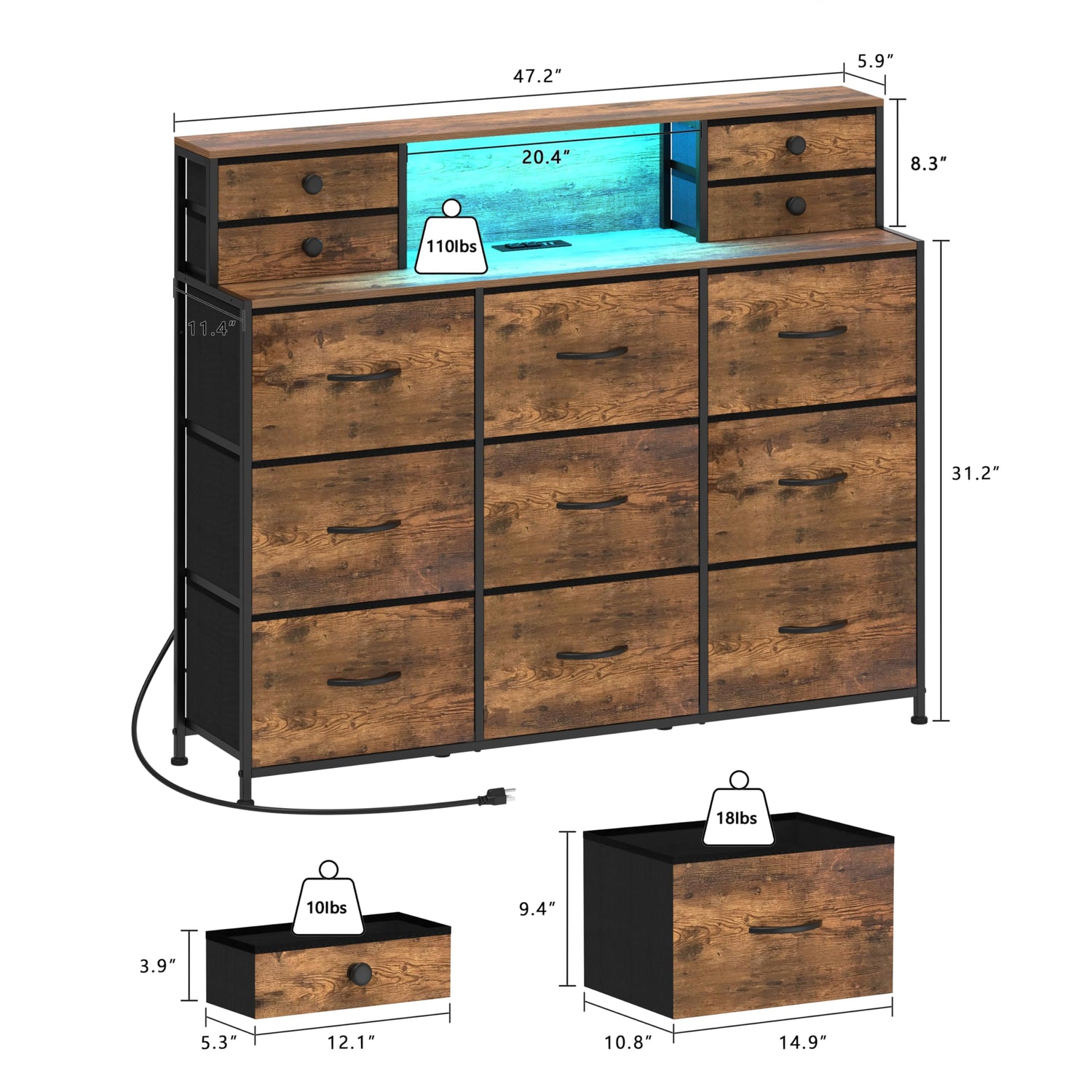 Details: Welfuturer Rustic Dresser with Charging Station and LED Lights Large 13 Drawers Dresser Fabric Chest of Drawers for Bedroom Living Room Hallway Entryway Closets Sturdy Frame Wood Top Brown