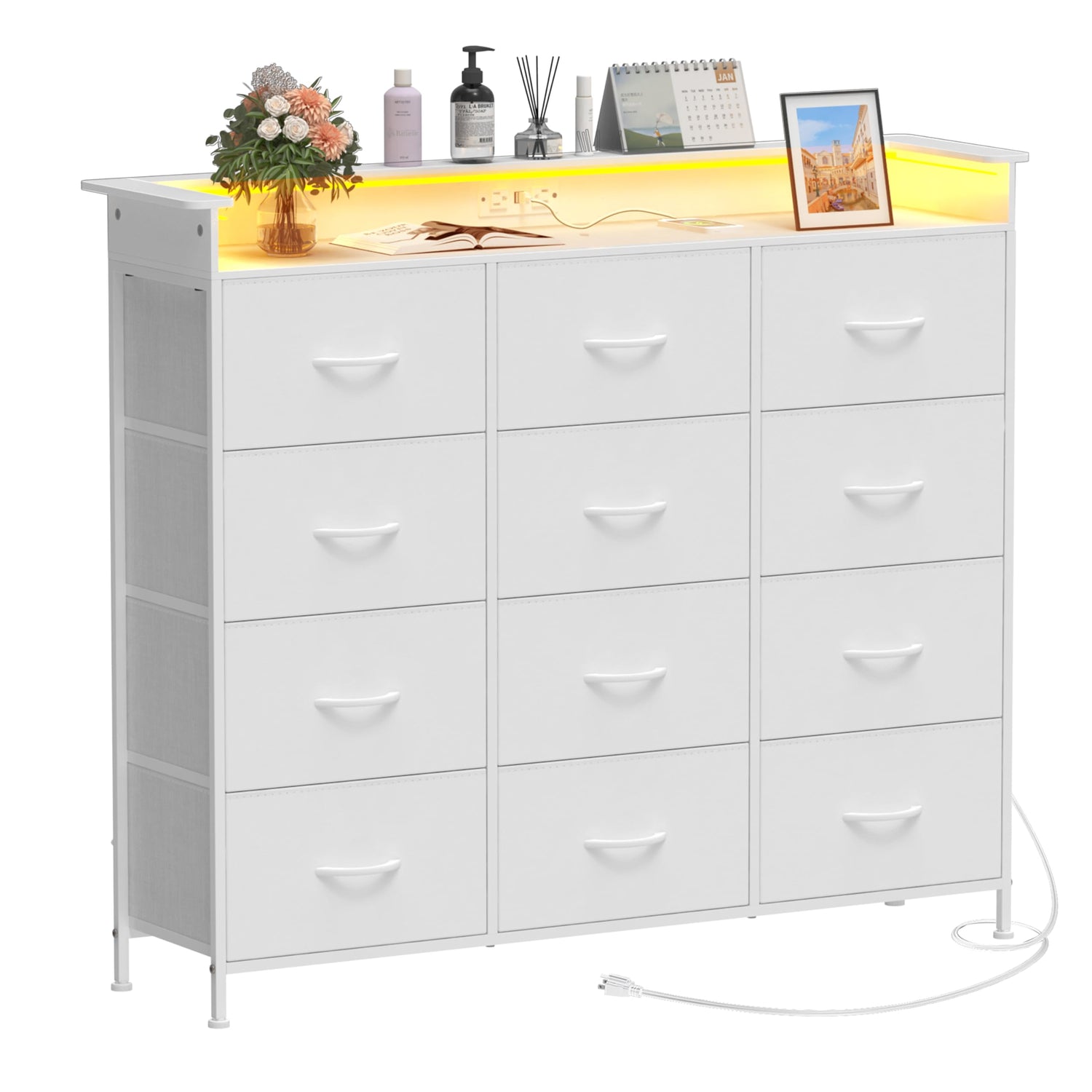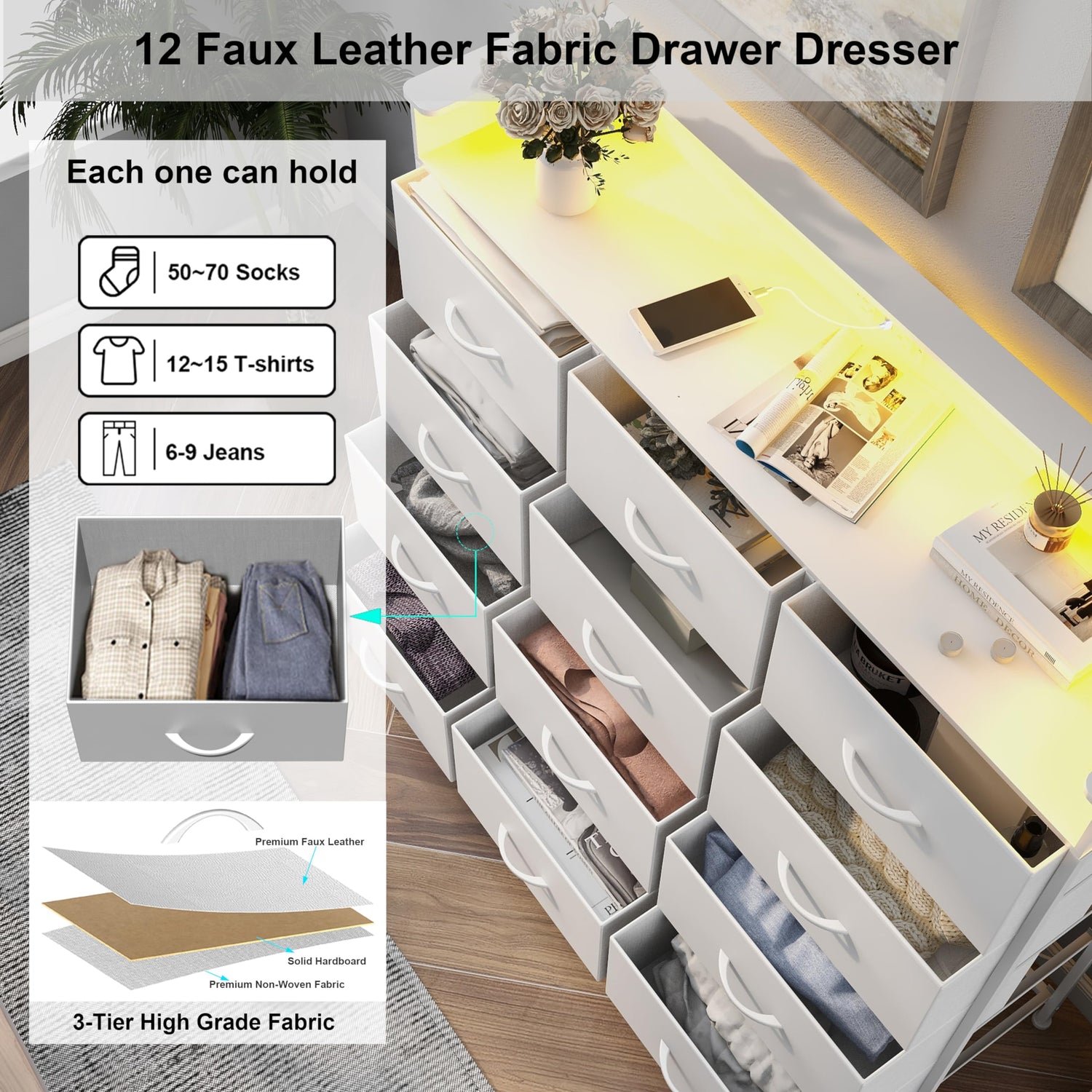 Details: Welfuturer White Dresser with LED Lights and Charging Station for Bedroom 12 Drawers Dressers & Chest of Drawers Tall Dressers for Hallway Entryway Closets Living Rom Sturdy Steel Frame Wood Top