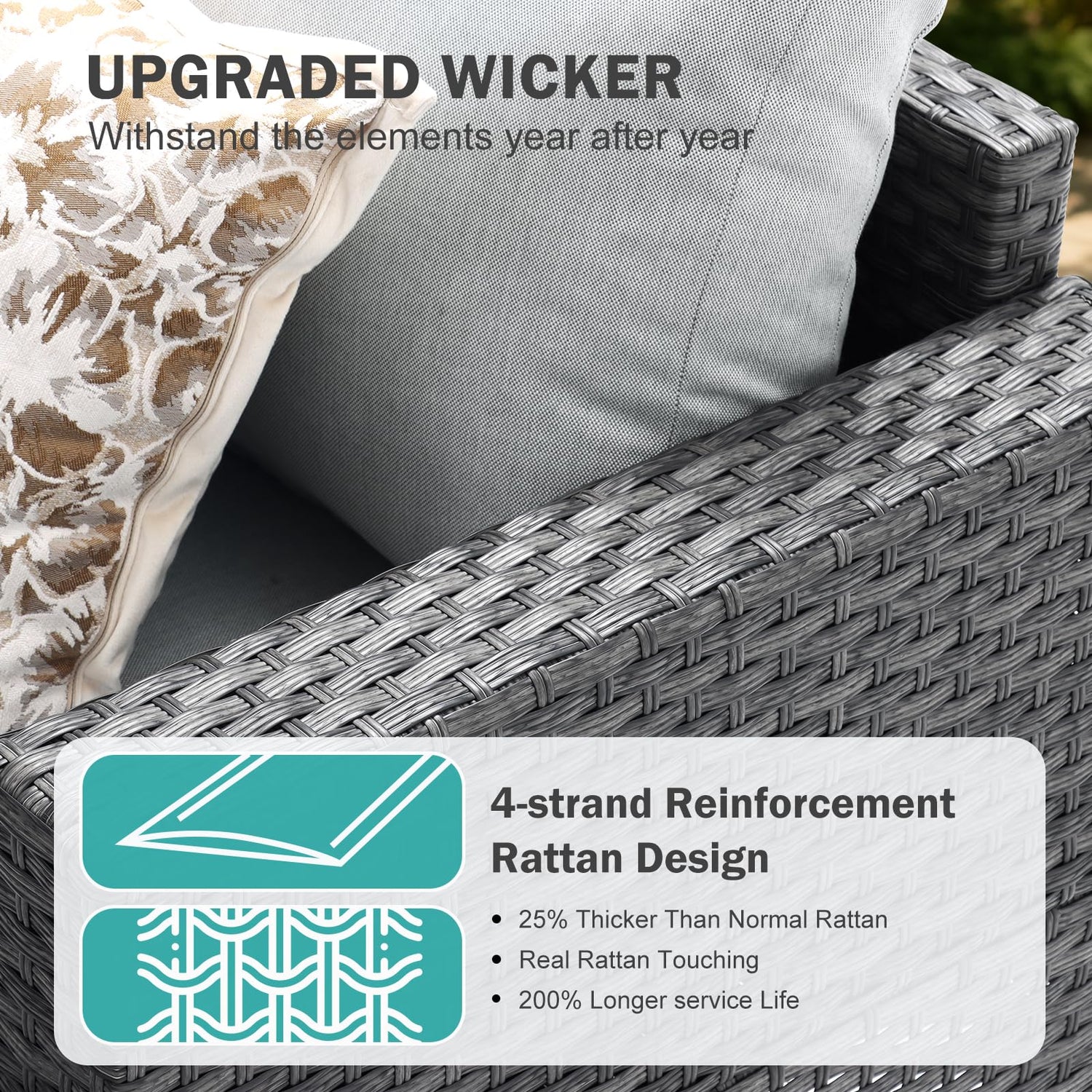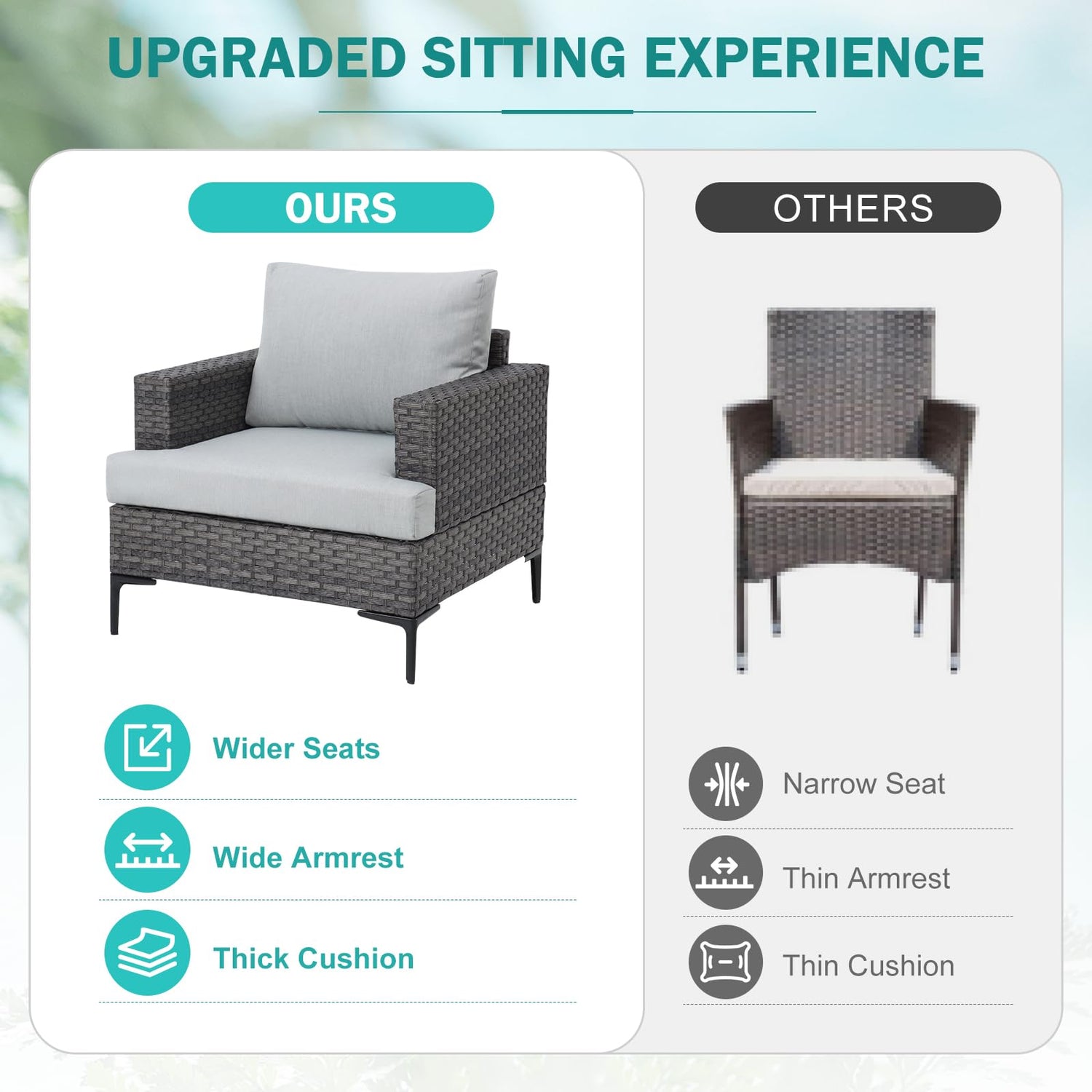 - 【US Average Size Seat】We have designed a larger seat size than some of our competitors. The seat width of 27 inches is suitable for most American adults of average build. With soft cushions and smooth rattan, this patio furniture set can offer you more comfort.