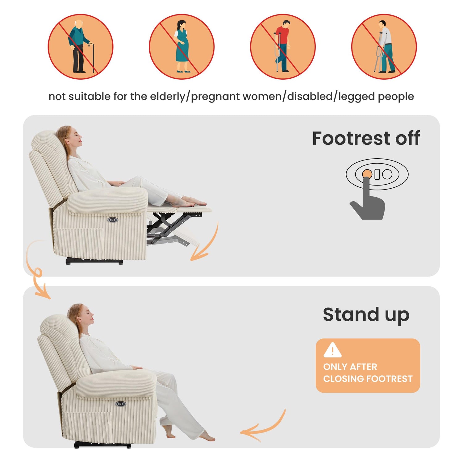 - 【LASTING FRESHNESS & COZY VIBE】The corduroy fabric of our electric recliner chair isn’t just soft to the touch—it’s also durable and wear-resistant, standing up to daily use. Though the fabric isn’t removable for washing, a gentle wipe with a damp cloth easily takes care of minor stains, keeping your recliner looking fresh for years. It’s also a perfect addition to your home decor, and it becomes a warm focal point that elevates the cozy atmosphere of your living room, bedroom, or study.