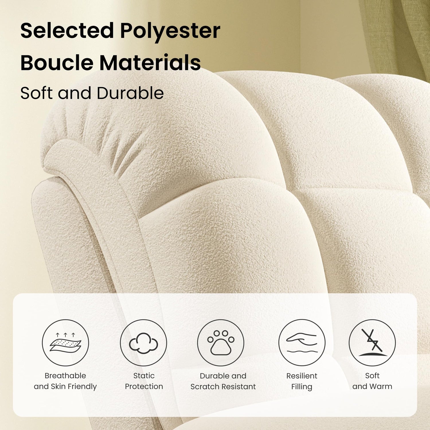 - 【LASTING FRESHNESS & COZY VIBE】The premium teddy fabric of our electric recliner chair isn’t just soft to the touch—it’s also durable and wear-resistant, standing up to daily use. Though the fabric isn’t removable for washing, a gentle wipe with a damp cloth easily takes care of minor stains, keeping your recliner looking fresh for years. It’s also a perfect addition to your home decor, and it becomes a warm focal point that elevates the cozy atmosphere of your living room, bedroom, or study.