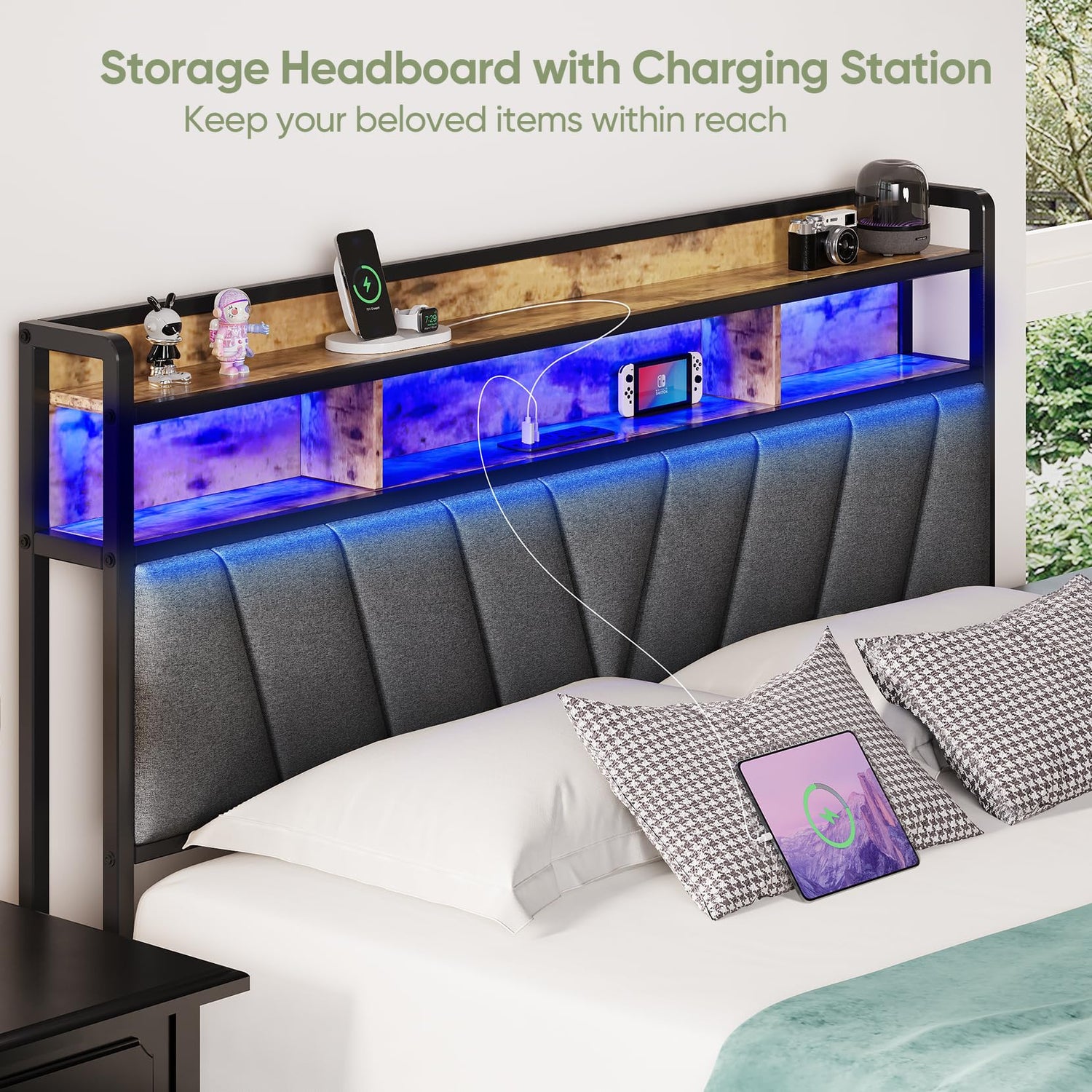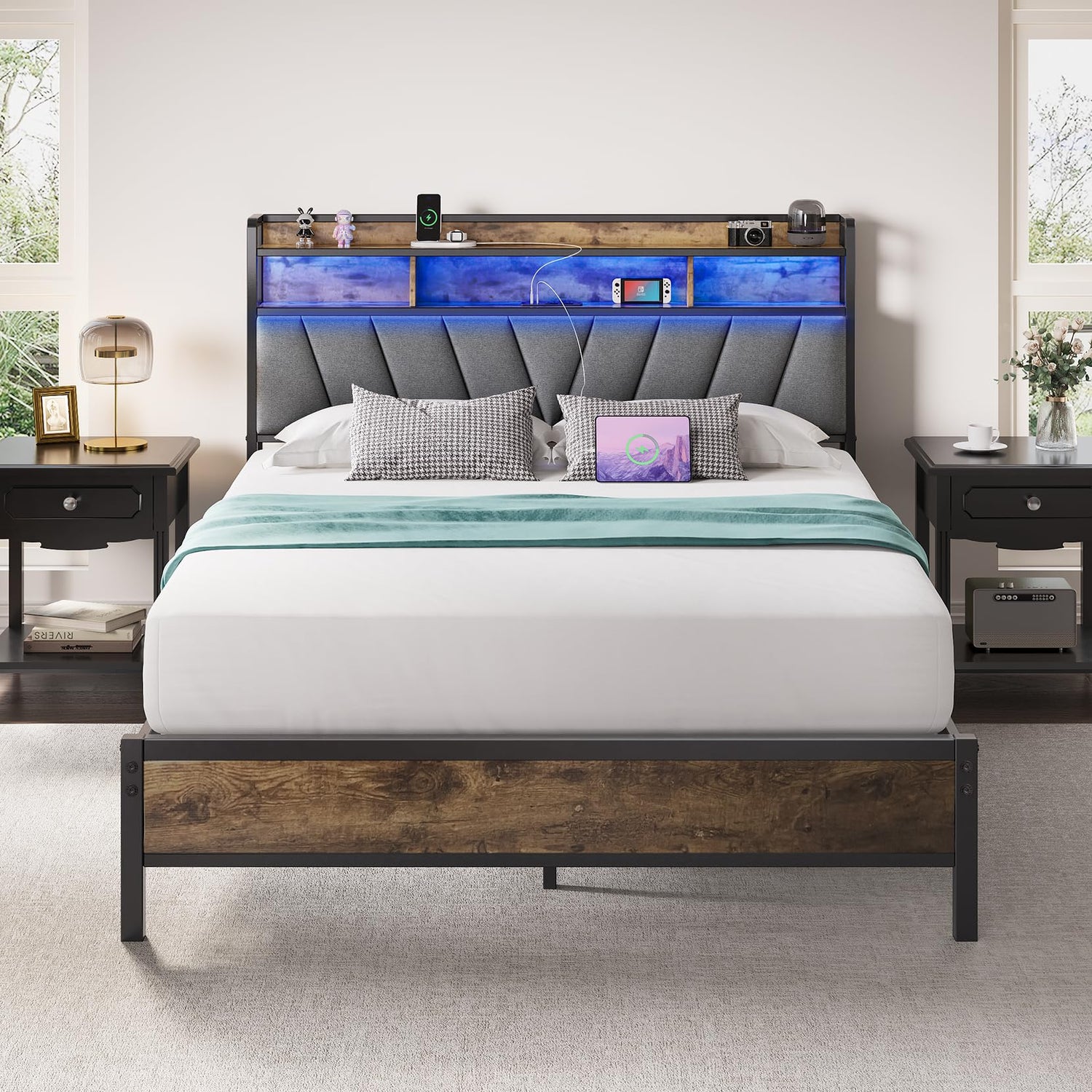 Welzona Queen Bed Frames with Headboard, LED Lights Queen Size Bed Frames with Charging Station, Sturdy and Noise-Free, Storage Space Under Bed, No Box Spring Needed, Brown