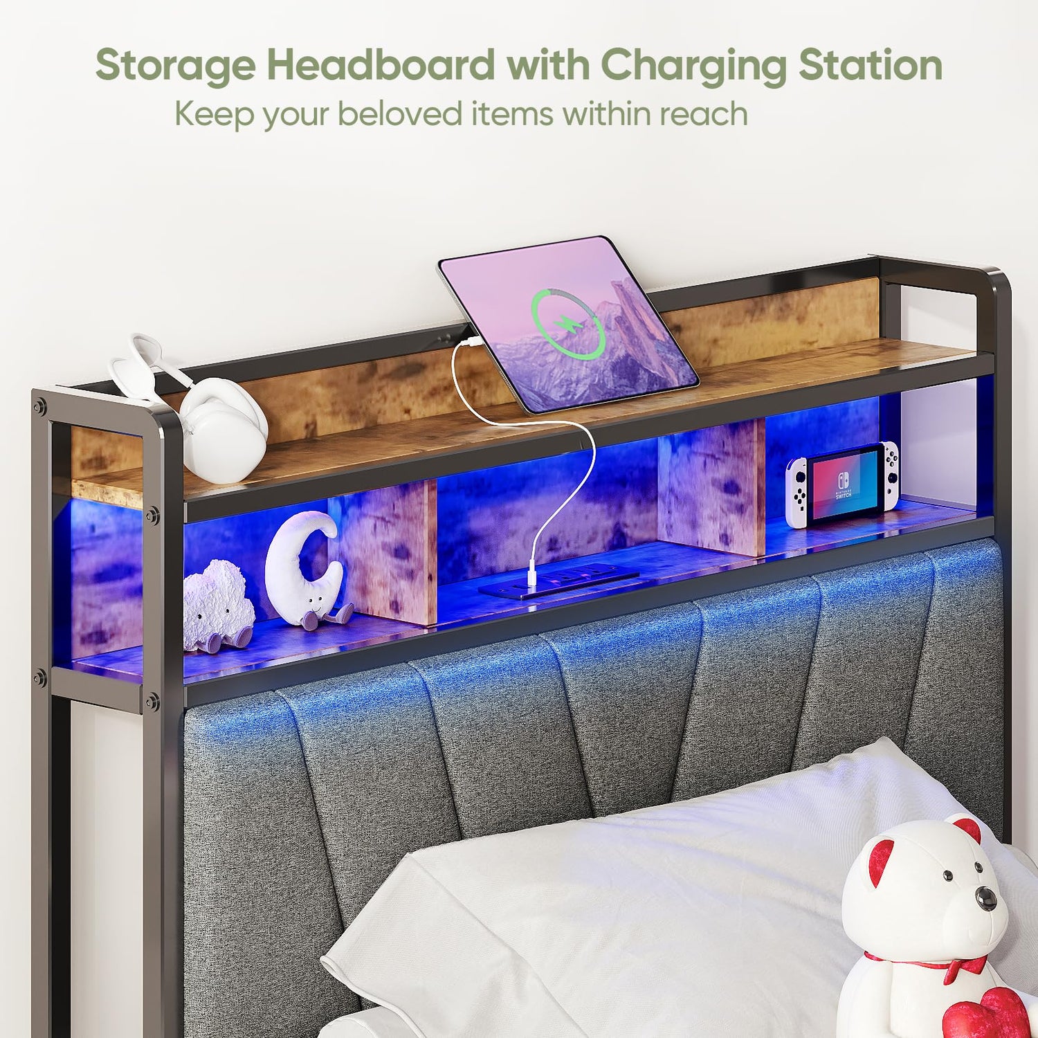 - [Organize Your Essentials with Ease] Welzona bed frame features a charging station for added convenience when using your phone or tablet in bed. Additionally, there is ample storage space on the metal bed frame to keep your favorite small items within reach on the headboard