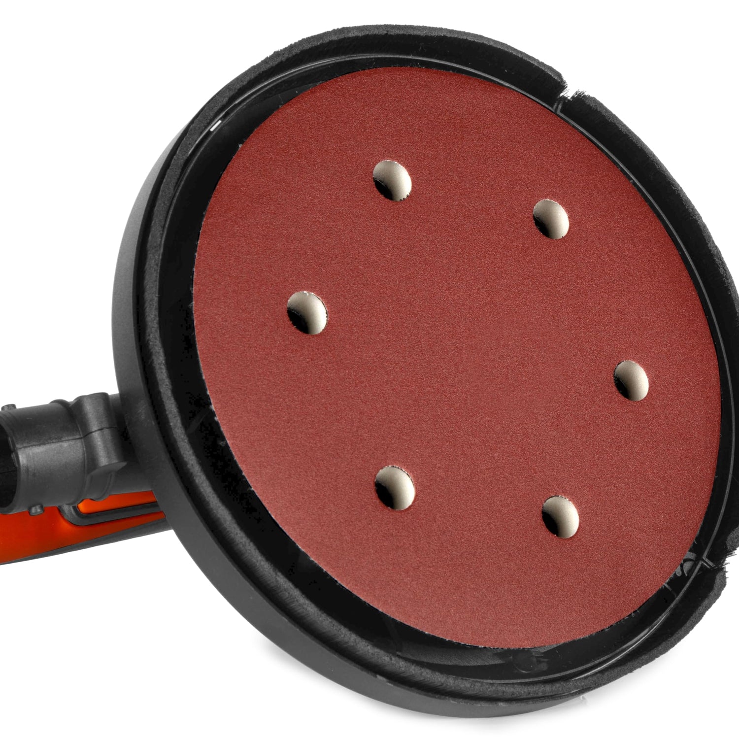 - Features a dust hose, eight 9-inch sanding discs of assorted grits, a shoulder strap, a dust collection bag, and a two-year warranty