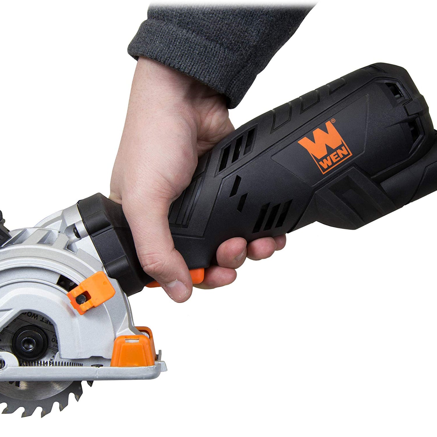 Details: Remember when you could make cuts quickly and easily? The WEN 5-Amp Plunge Cut 3-1/2-Inch Mini Circular Saw provides versatile and powerful performance all in the palm of your hand. Perfect for wood flooring, drywall, tile, sheet metal, pipes, carpet and more. Its compact design weighs in at a mere 5 pounds, limiting fatigue during operation and making for easy storage between jobs. The 5-amp motor provides maximum torque, spinning the 3-1/2 inch blade (89mm, 10mm arbor) up to 4500 RPM. Attack boards up to 1-1/8 inch in thickness. Adjust the depth stop to your desired cutting depth for the perfect plunge cut in even the hardest of woods. Your WEN Compact Circular Saw also comes packed with accessories, including a carbide-tipped wood-cutting blade, a diamond-coated tile-cutting blade, a soft metal and plastic-cutting blade, a 5-inch rip fence, a dust extraction tube, and a convenient blow-mold carrying case, complete with storage compartments for all your accessories. And, because its a WEN product, your handheld circular saw comes backed by a nationwide network of skilled service technicians, a friendly customer help line and a two year warranty, all to make sure you remember WEN.