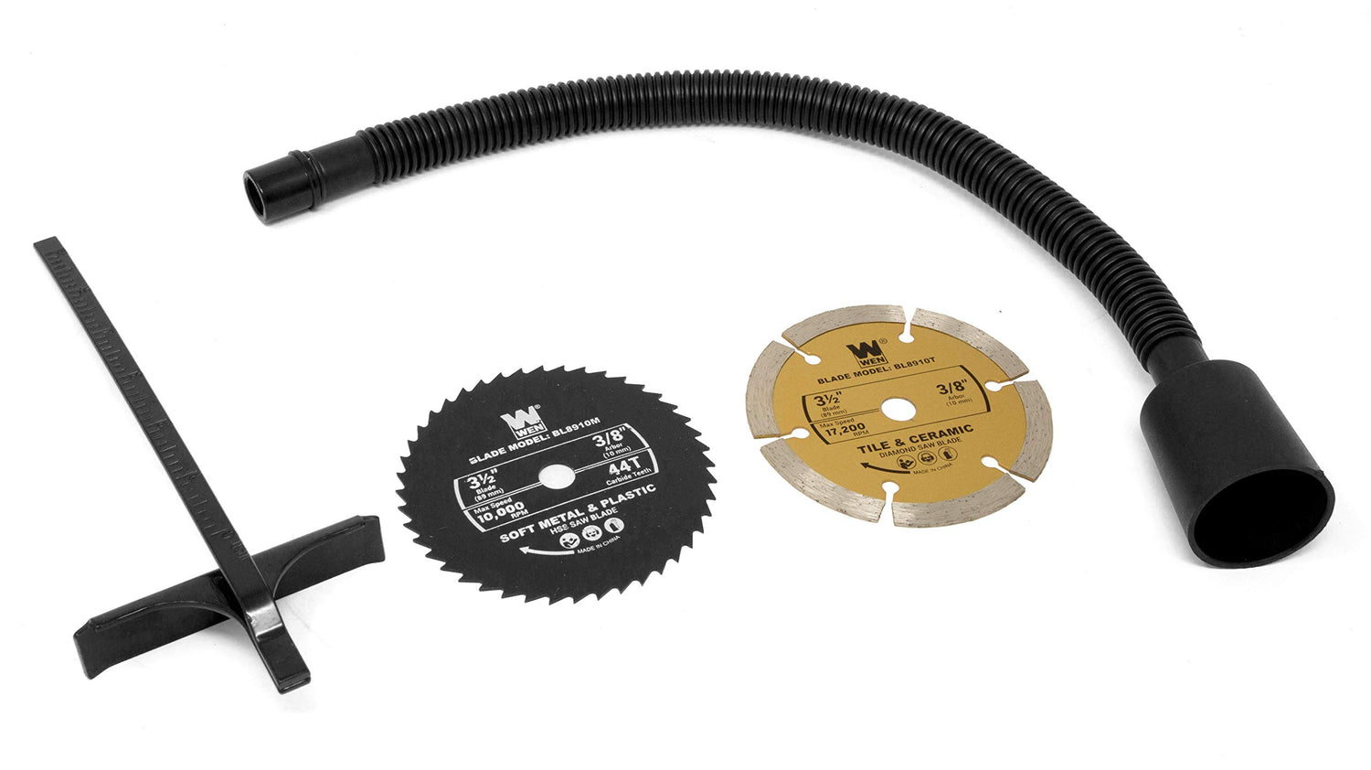 - Includes an HSS metal-cutting blade, a diamond-coated tile-cutting blade, a carbide-tipped wood cutting blade, a carrying case, a dust extraction tube, a rip-guide fence, and a two-year warranty