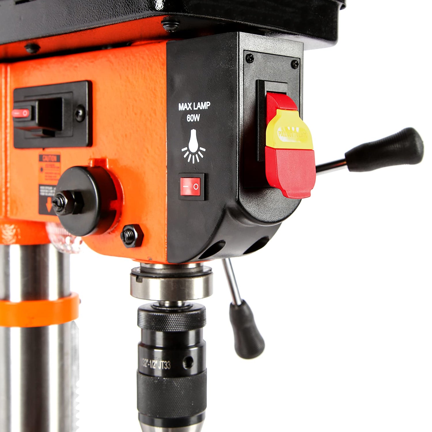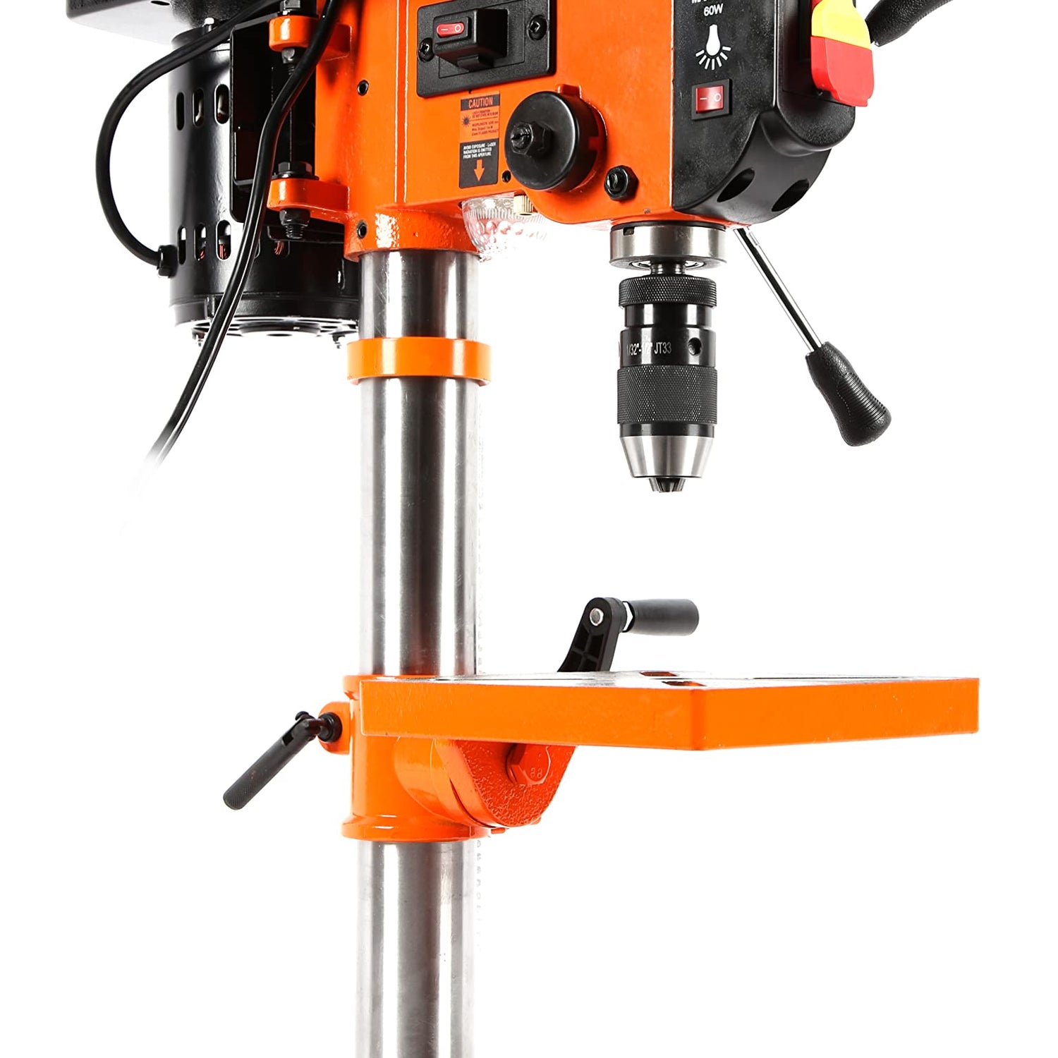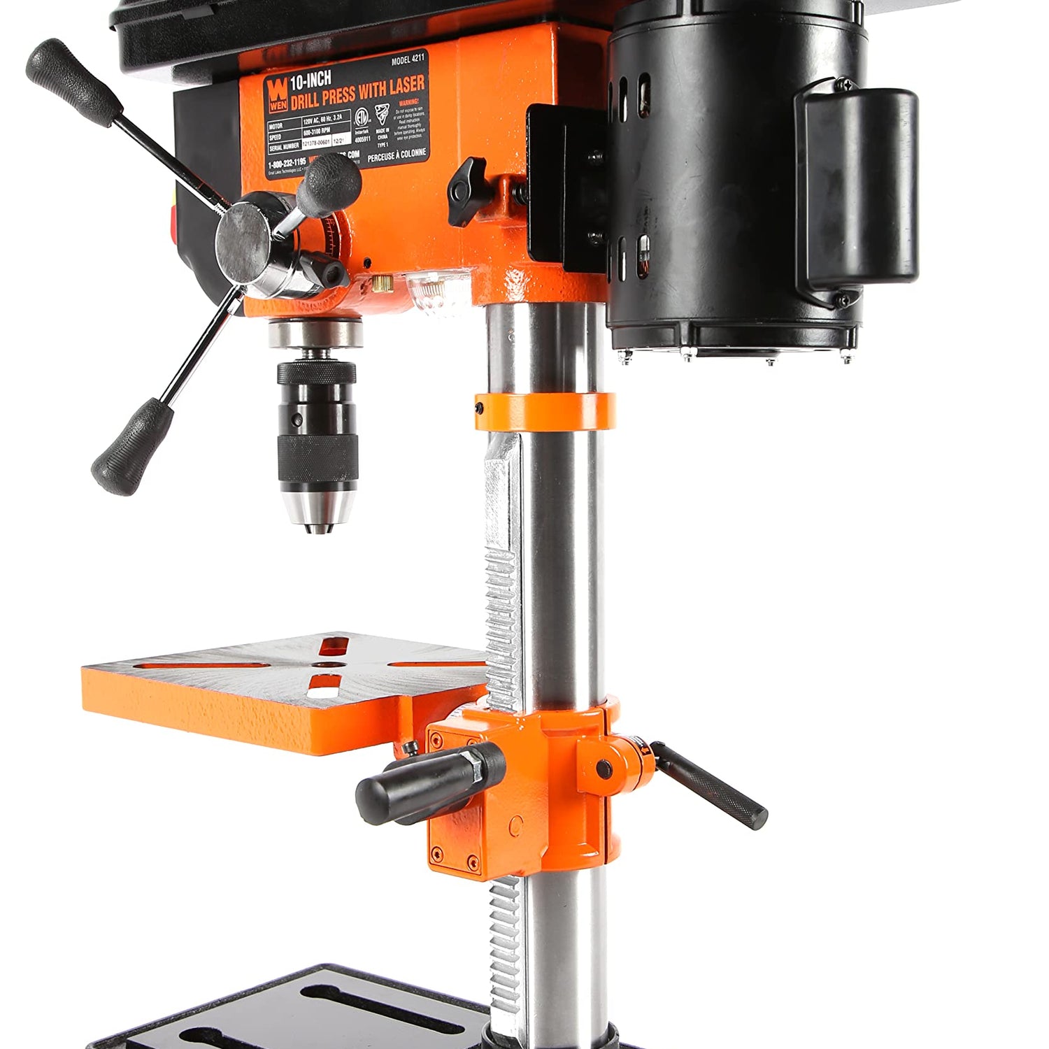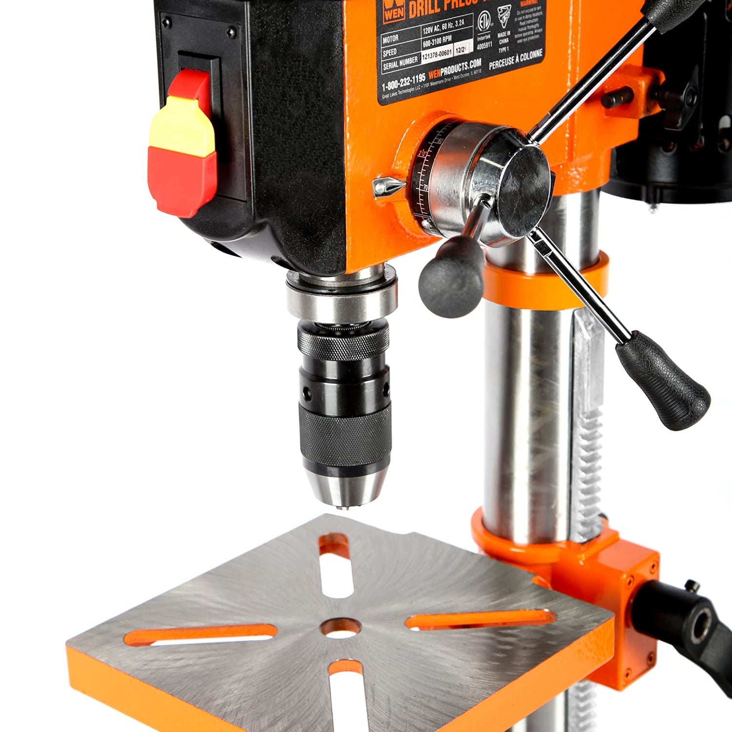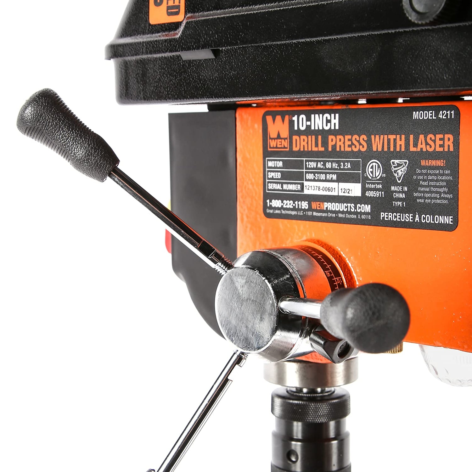 Details: Remember when you could drill with maximum accuracy? Power through metal, wood, plastics, and more with the WEN 10-Inch 5-Speed Drill Press. Don’t let our compact design fool you. Between the five operating speeds, the 2-1/2-inch spindle travel, and the sturdy construction, you’ll have way more precision than a standard handheld drill. Our 3.2-amp induction motor features ball bearings for smooth, balanced performance, even at high speed. Easily set your speed to either 600, 1100, 1700, 2400, or 3100 RPM by adjusting the belt position on the two spindles. The easy-to-read, locking depth stop allows for accurate and repeatable drilling operations. The keyless chuck with JT33 spindle taper accepts bits ranging from 1/20 to 1/2 inch in diameter (1.5 to 13 mm). The X-pattern Class II 1mW laser pinpoints the drill location, eliminating guesswork and sparing expensive materials. The table bevels 45° left and right for angled drilling. The base is designed with holes for mounting onto a bench or work stand. Clamps and vises are easily mounted to the slotted table, making work-holding safe and effective. And because it’s a WEN product, your 10-inch drill press comes backed by a two-year warranty, a stocked inventory of replacement parts, and a helpful customer phone line. Remember when you could drill holes in almost anything? Remember WEN