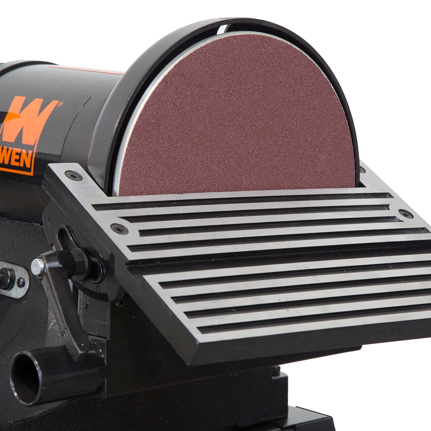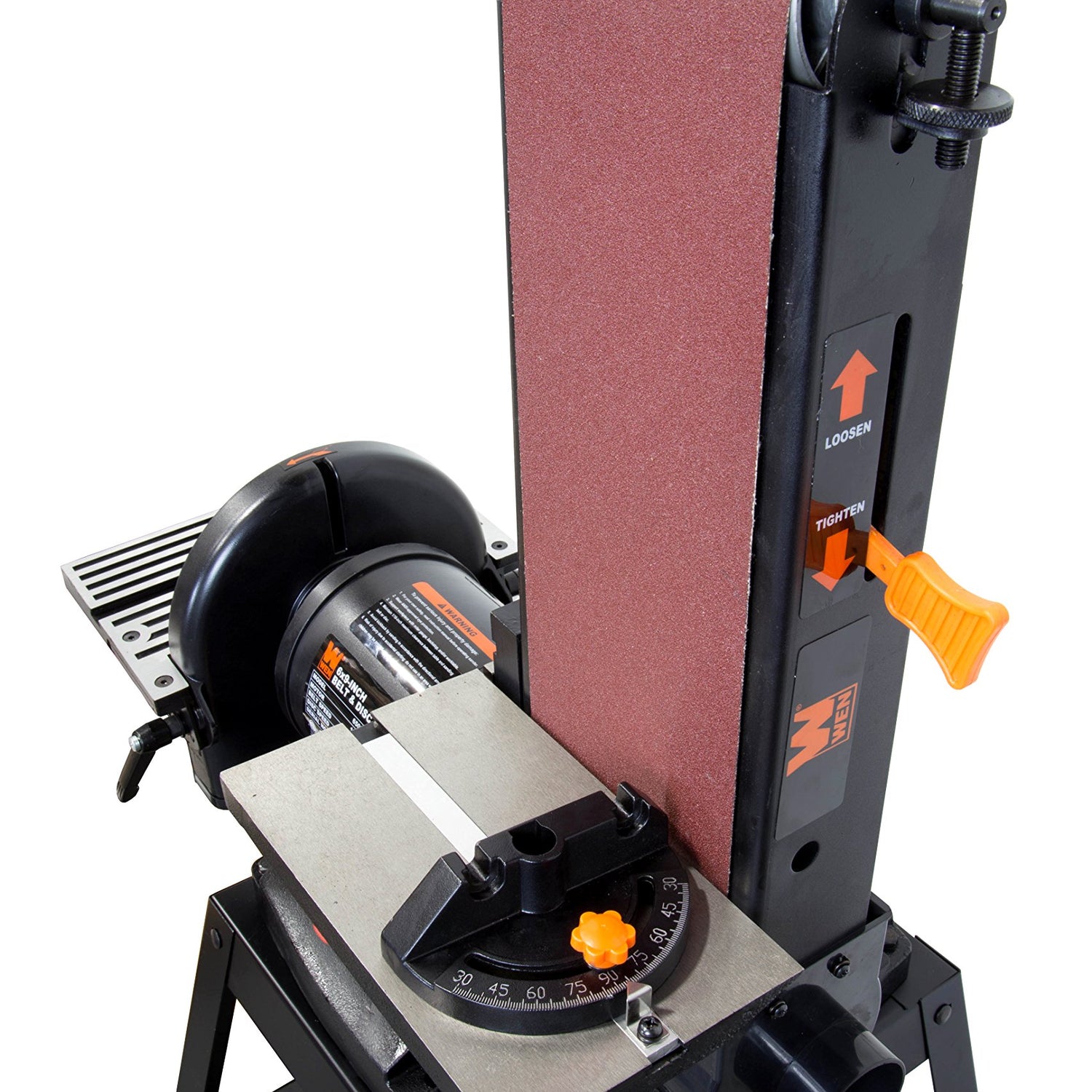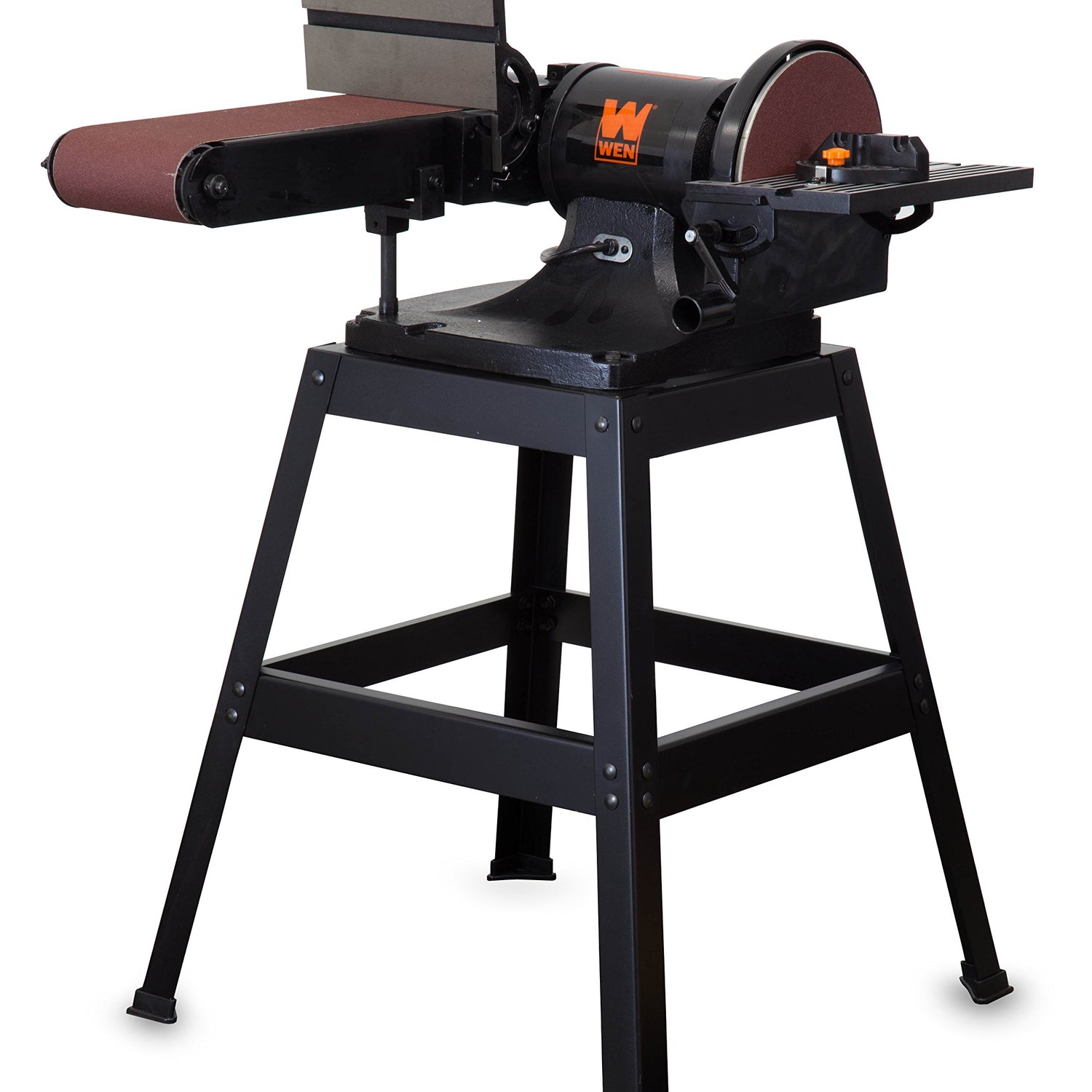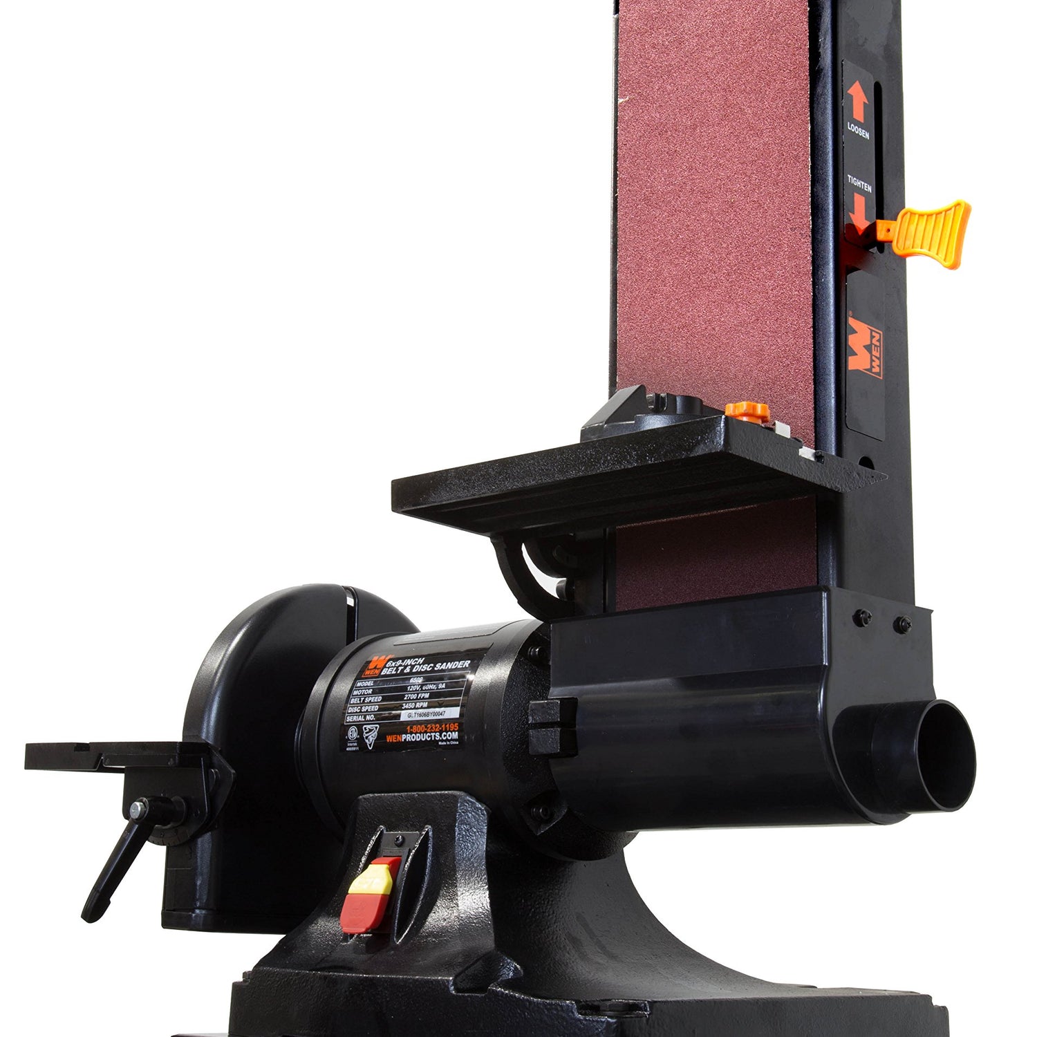Details: Remember when your sander was a stander? Smooth out intricate contours or remove material quickly with the WEN 6 x 48-Inch Belt and 9-inch Disc Sander with Stand. The heavy-duty body provides enough weight to prevent walking and vibration during use while the steel stand keeps sanding surfaces elevated over three feet off the ground. Our powerful 9A motor prevents the unit from bogging down under even the largest of loads, providing a belt speed of 2700 feet per minute and a disc speed of 3450 rotations per minute. The tension quick release lever gives you the power to switch and replace sandpaper grits as needed without wasting any time, making belt changes easier than ever. The spacious 11-3/4 x 6 inch disc table bevels up to 45 degrees while the belt tilts anywhere from 0 to 90 degrees to accommodate the needs of your particular project. The adjustable 9-3/4 x 5-3/4 inch sanding support doubles as both a work table and a work stop depending on the orientation of the belt. This package also includes an 80-grit sanding disc, an 80-grit sanding belt, a miter gauge for angled sanding, and two dust ports for minimal cleanup. And, because its a WEN product, your purchase comes backed by a two-year warranty, a nationwide network of skilled service technicians and a friendly customer help line. The WEN 6 x 48-Inch Belt Sander with 9-Inch Disc and Stand provides users the versatility of smaller sanders with the capacity of larger industrial models. Remember when you could sand even the largest of workpieces? Remember WEN.