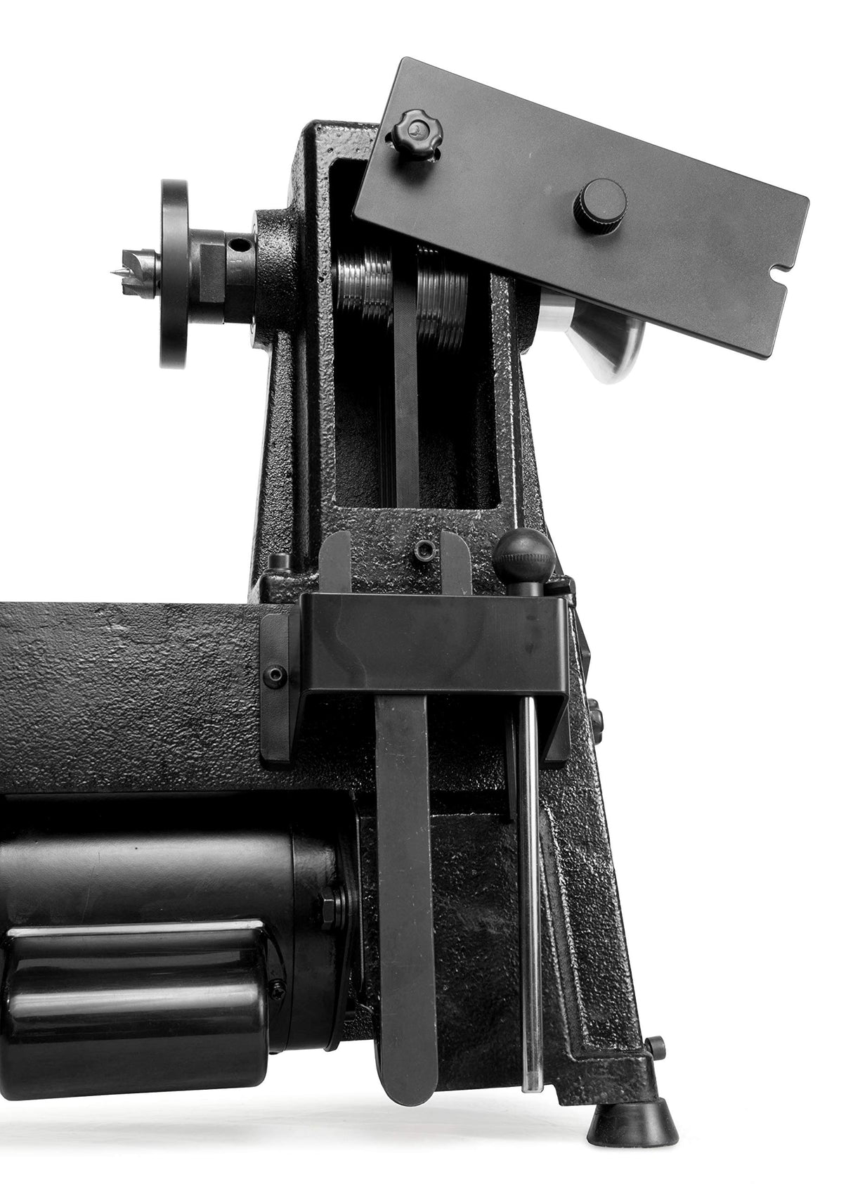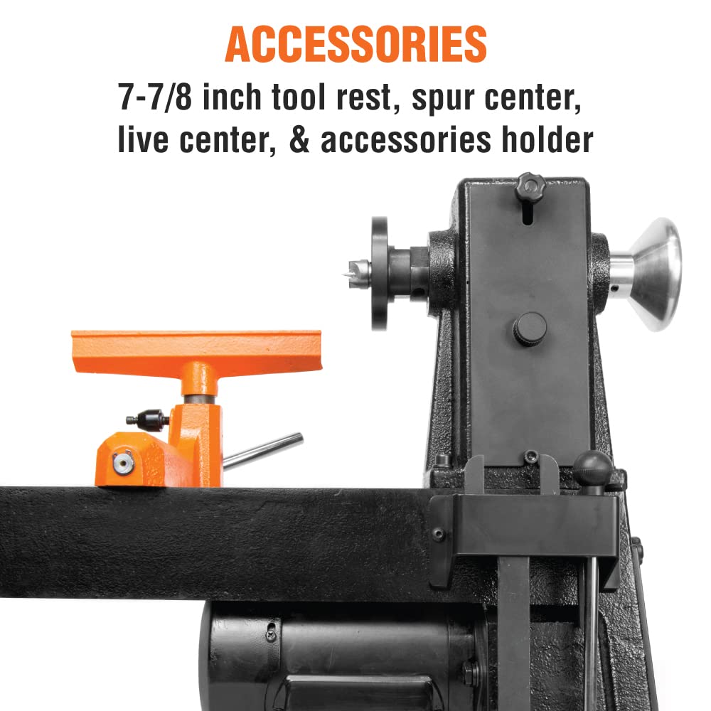 - Features a 4.5A motor, an MT2 headstock spur center, an MT2 tailstock live center, an 8-inch tool rest, and an onboard accessory holder