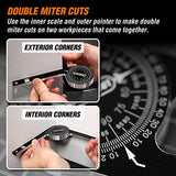 - Measure single cuts using the outer scale or miter cuts with the inner scale