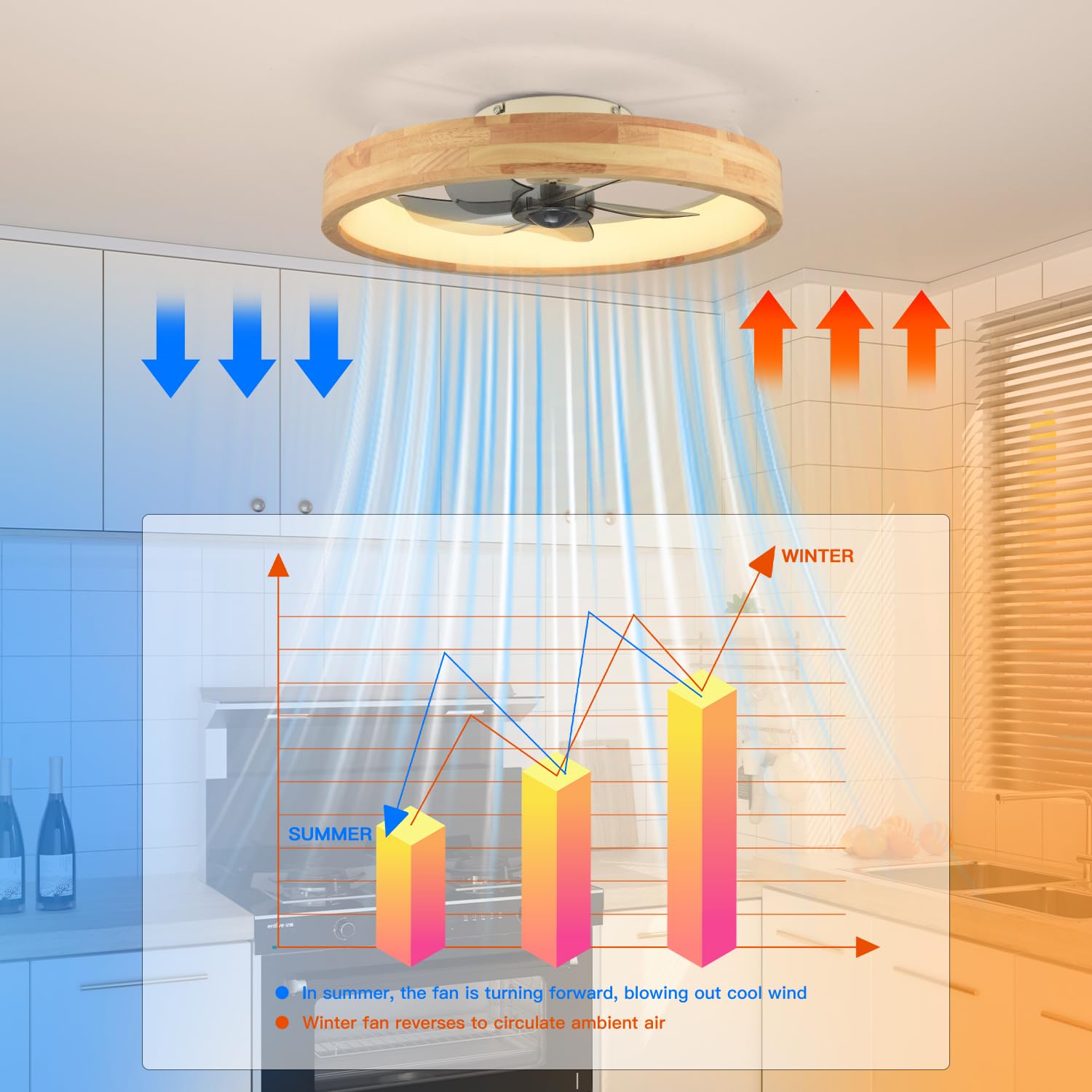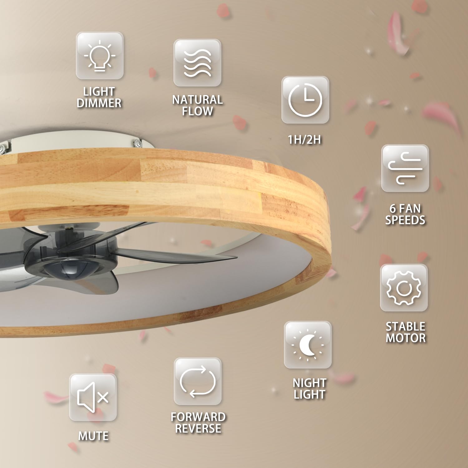 WenineStar 20” Ceiling Fan with Light, Dimmable LED Timing with Remote Control, 5 Invisible Reversible Blades Semi Flush Mount Low Profile Fan, Wood
