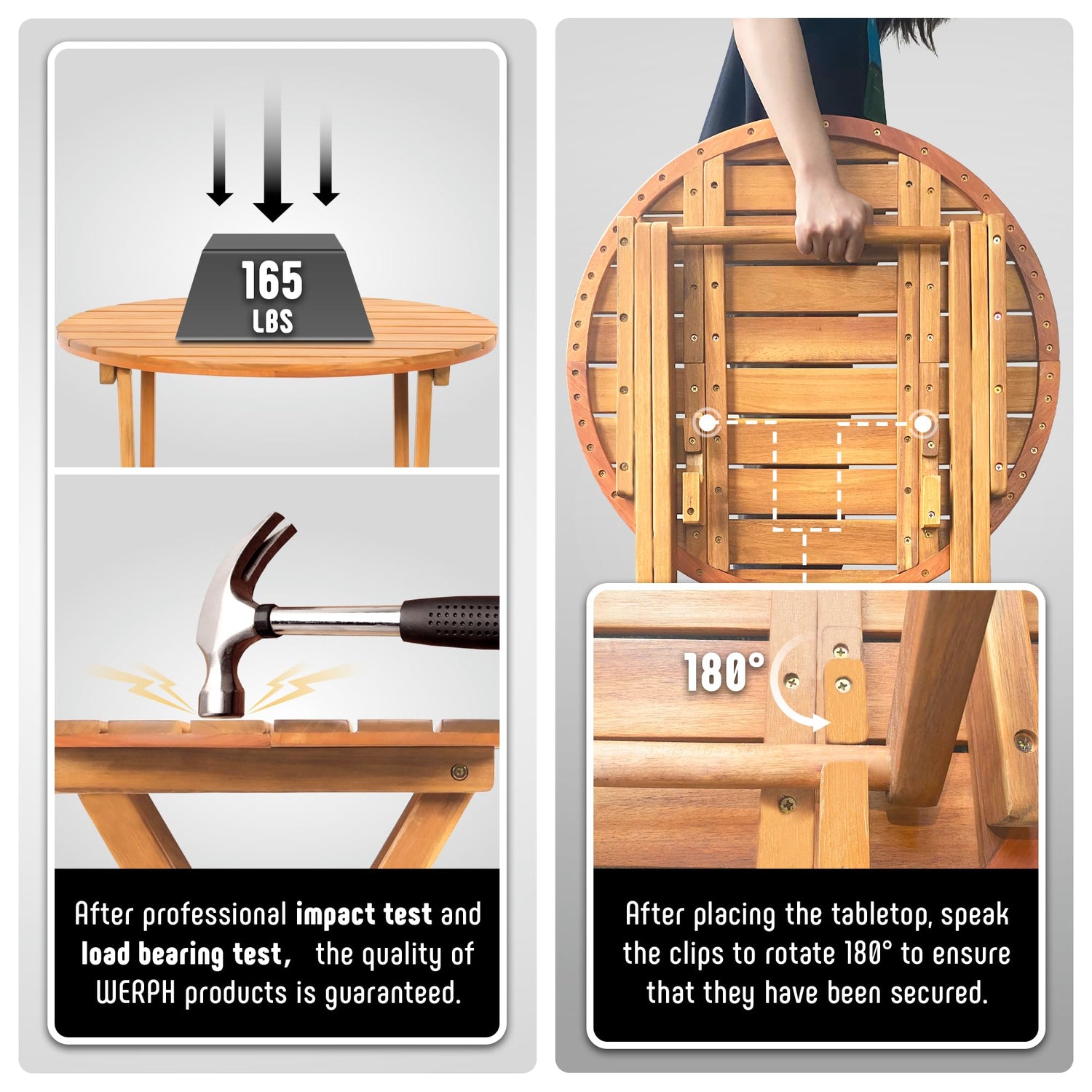Werph 3-Piece Acacia Wood Patio Set, Foldable Bistro Table and Chairs Set of 2,Small Patio Furniture Set with Cushions,Folding Balcony Chairs Table Set for Apartment, Balcony, Deck or Porch