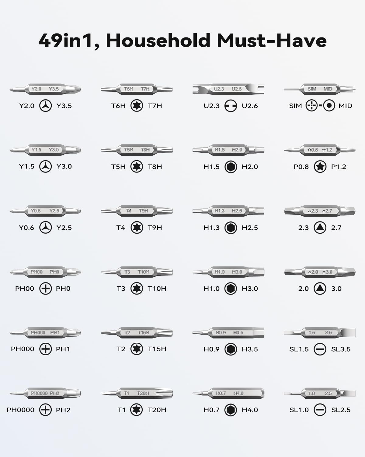 • [49in1, Household Must-Have] This small screwdriver head adopts double-sided design, making it more compact and comprehensive, it comes with 49 different bits (Phillips, Flat, Torx, Torx Security, Pentalobe, Hexagon, etc.). Whether you're a professional fixer or a home repair hobby, this mini screwdriver set has what you need to disassemble, repair, and reassemble phones, game consoles, wearables, laptops, desktops, tablets and much more!