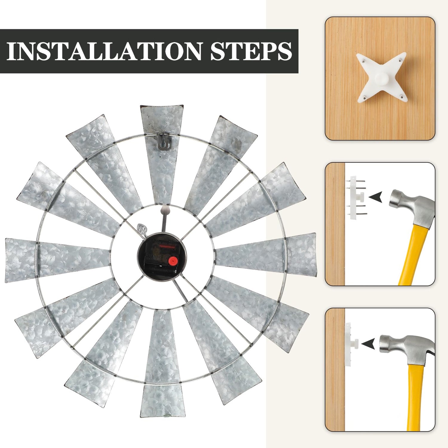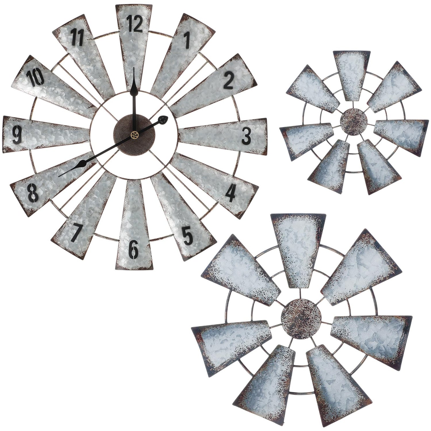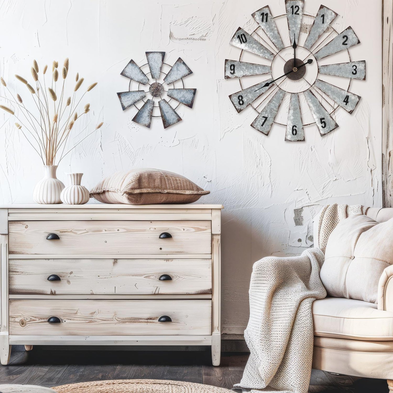 - Packaging: our farmhouse wall decorations include 1 pcs metal windmill clock, and 2 pcs metal windmill wall decors; The clock measures 20 inches in diameter and the metal wall decor is available in sizes 11 and 15 inches; Our rustic wall decor gives you plenty of options to fit your wall space