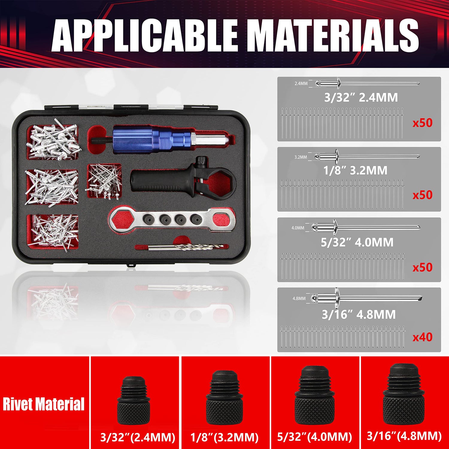 - [Specifications and Packaging]: Electric riveter conversion connector set: 190 pcs riveter 50x2.4mm,50x3.2mm,50x4.0mm,40x4.8mm,4pcs drill bit: 2.5-3.3-4.1-4.9mm,1pc rivet gun adapter,1pc riveter multi-function wrench,1pc clamping fixture,3 pcs jaw,4 pcs changeable nozzle bolt:2.4mm,3.2mm,4.0mm,4.8mm.All in a plastic case.