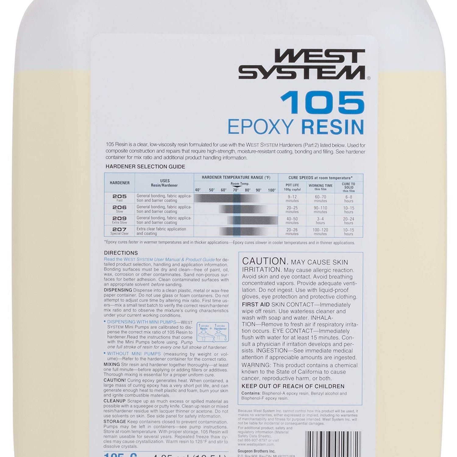 • 105 EPOXY RESIN is the base material on which all WEST SYSTEM 105 System epoxy compounds are built. It is a clear, pale yellow, low-viscosity liquid epoxy resin. Blended at the correct ratio with one of 4 WEST SYSTEM hardeners, it cures to a high-strength solid that is functionally waterproof, highly resistant to moisture vapor. Based on which hardener you choose, it cures at a wide range of temperatures.