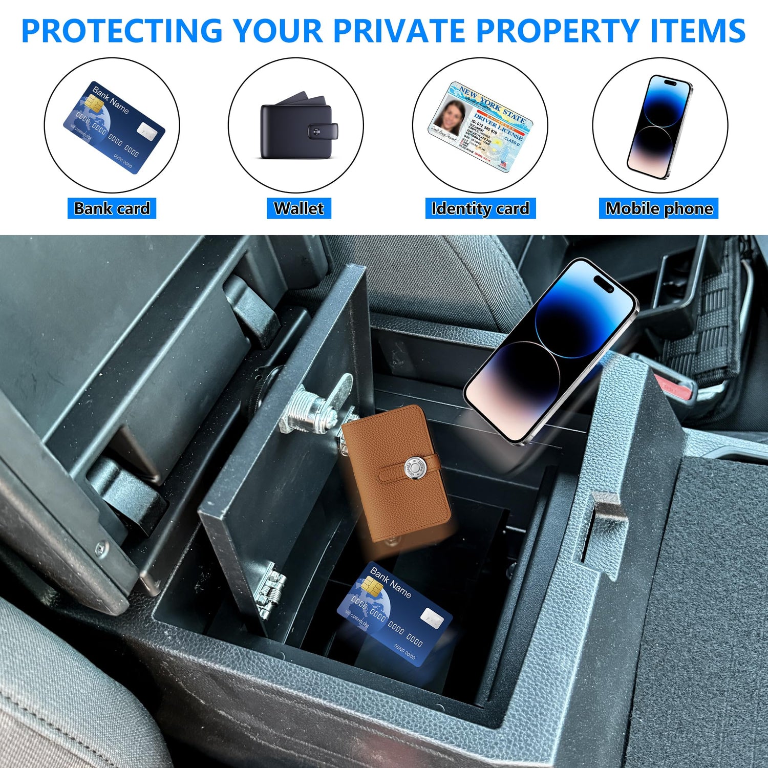 • HIGH-QUALITY MATERIAL: The centre console armrest lock safe is made of high quality carbon steel material and black powder coated surface polishing process. The surface texture is clear, durable, scratch-resistant and not easy to deform. It provides high-end and fashionable decoration for your car. style and provides a safe space for storing valuables. Keep your centre console neat and tidy.