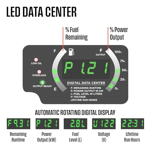 - Led Data Center: Rotating Digital Display Shows Fuel Level, Power Output, Remaining Run Time, and Voltage Output