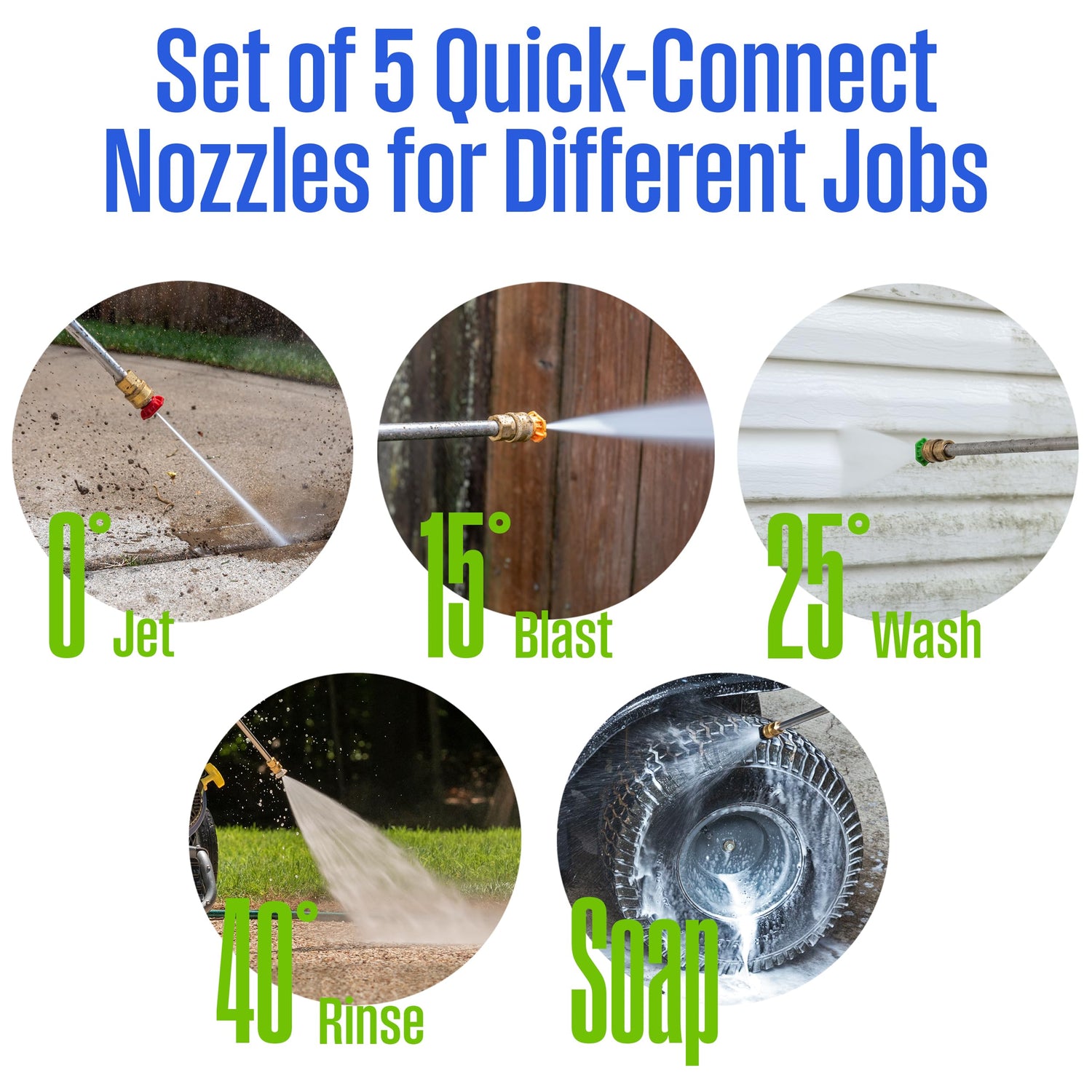 - 25′ Foot Abrasion Resistant Super-Flex Hose With Lightweight High Pressure Spray Gun and 5 Quick Connect Nozzles (0°, 15°, 25°, 40° & Soap)