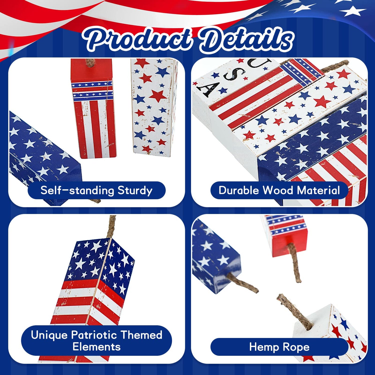 - Size Information: the 4th of July tiered tray decor respectively measures about 5.91 x 1.18 x 1.18 inches/ 15 x 3 x 3 cm, 5.12 x 1.18 x 1.18 inches/ 13 x 3 x 3 cm, 4.33 x 1.18 x 1.18 inches/ 11 x 3 x 3 cm, 3.54 x 1.18 x 1.18 inches/ 9 x 3 x 3 cm and 2.76 x 1.18 x 1.18 inches/ 7 x 3 x 3 cm, you can use them as a whole or put them in separate locations to enhance the rustic and vintage feeling